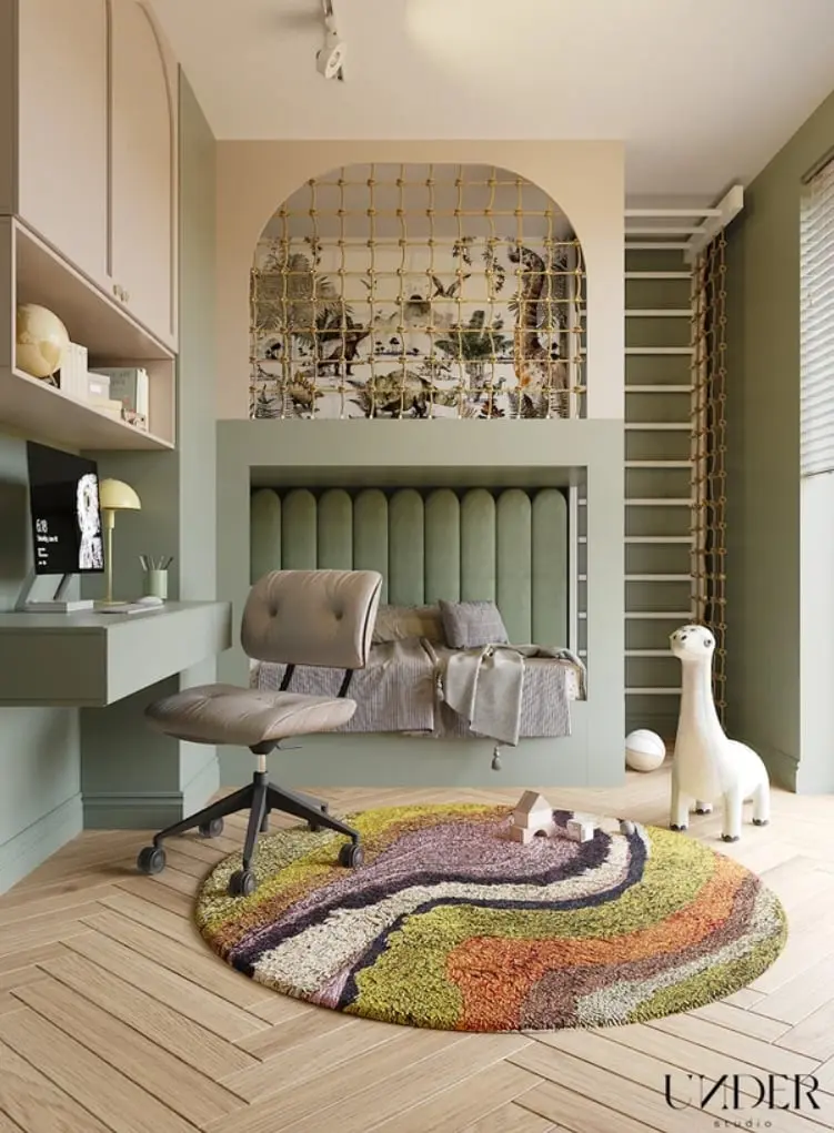 Pokój dla chłopca, młodego odkrywcy, który fascynuje się dinozaurami. Spokojna naturalna kolorystyka oraz ciekawe rozwiązania sprzyjają rozwojowi malucha. Planując przestrzeń dla dziecka, bierzemy pod uwagę wiele czynników. Wygoda i bezpieczeństwo to priorytety, które stają na czele podejmowanych wyborów. Ale oprócz tych podstawowych funkcji pokoju dziecka, ważne jest również, żeby maluch czuł się dobrze i otaczał się przedmiotami, które mu się podobają i są zgodne z jego zainteresowaniami.