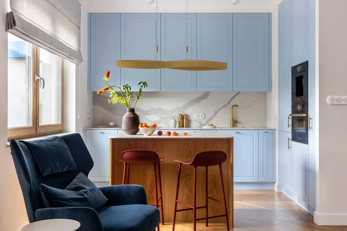 Właściciele mieszkania kochają błękit i sami wybrali odcień, który dominuje we wnętrzu. Chcieli, by ich wakacyjne lokum było jasne i w klasycznym stylu. Projektantki zaproponowały jednak ocieplenie aranżacji nie tylko akcentami w kolorze bordo, ale również drewnem. Poza jodełką na podłodze, drewno pojawiło się na wyspie kuchennej oraz meblach, w tym lekkiej szafce RTV o pływowej formie. Natomiast w łazience wykorzystano plecionkę wiedeńską. Kolejnym spełnionym marzeniem Inwestorów jest wyspa kuchenna, którą udało się wygospodarować i stworzyć z niej serce strefy dziennej. Stanowi idealne miejsce nie tylko na poranna kawę, ale również sprzyja spotkaniom z rodziną i przyjaciółmi. Blat wyspy, podobnie jak pozostałe blaty w kuchni oraz okładzina ścienna zostały wykonane ze spieku o teksturze marmuru. W salonie stanęła welurowa sofa Alex i wygodny fotel z podnóżkiem od polskiej marki Sits. W jadalni zmieścił się dwumetrowy stół, nad którym zawisła mosiężna lampa w formie kapelusza.