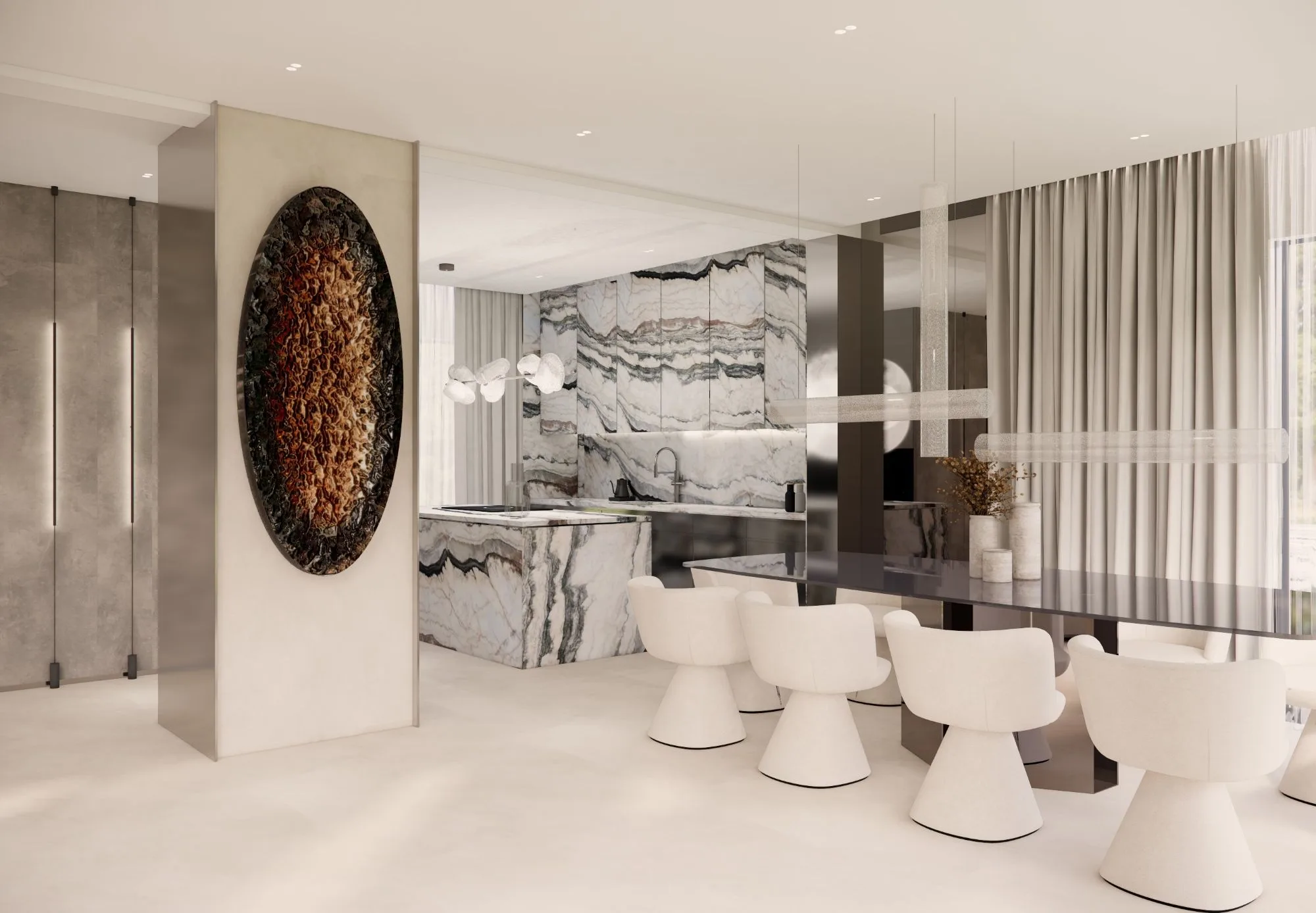 Prace nad projektem rozpoczęły się od zmian w układzie funkcjonalnym. Aby powiększyć przestrzeń strefy dziennej, wyburzono ścianę jednego z pokoi, co tym samym, pozwoliło ograniczyć mało funkcjonalne ciągi komunikacyjne. Na 68m2 zorganizowano dwie wygodne sypialnie, otwartą strefę dzienną oraz łazienkę. Przestronny salon, podzielono na dwie części za sprawą przepierzenia, które wizualnie wydziela część wypoczynkową od kameralnej jadalni. Jak podkreślają projektantki z Bogdziewicz Studio – w tej realizacji wszystko zaczęło się od błękitu, który upodobali sobie właściciele mieszkania. Ten nieoczywisty kolor w odcieniu baby blue zdeterminował wygląd całej przestrzeni. Wykorzystano go w frontach zabudowy kuchennej, gdzie został zestawiony z marmurowymi spiekami. Dla mebli wypoczynkowych wybrano już ciemniejszy odcień niebieskiego, a abstrakcyjny obraz przypominający widok z lotu ptaka na morze i plażę, dopełnia spektrum błękitów wykorzystanych we wnętrzu. Poza strefą dzienną zabudowę w kolorze baby blue, znajdziemy również w łazience.