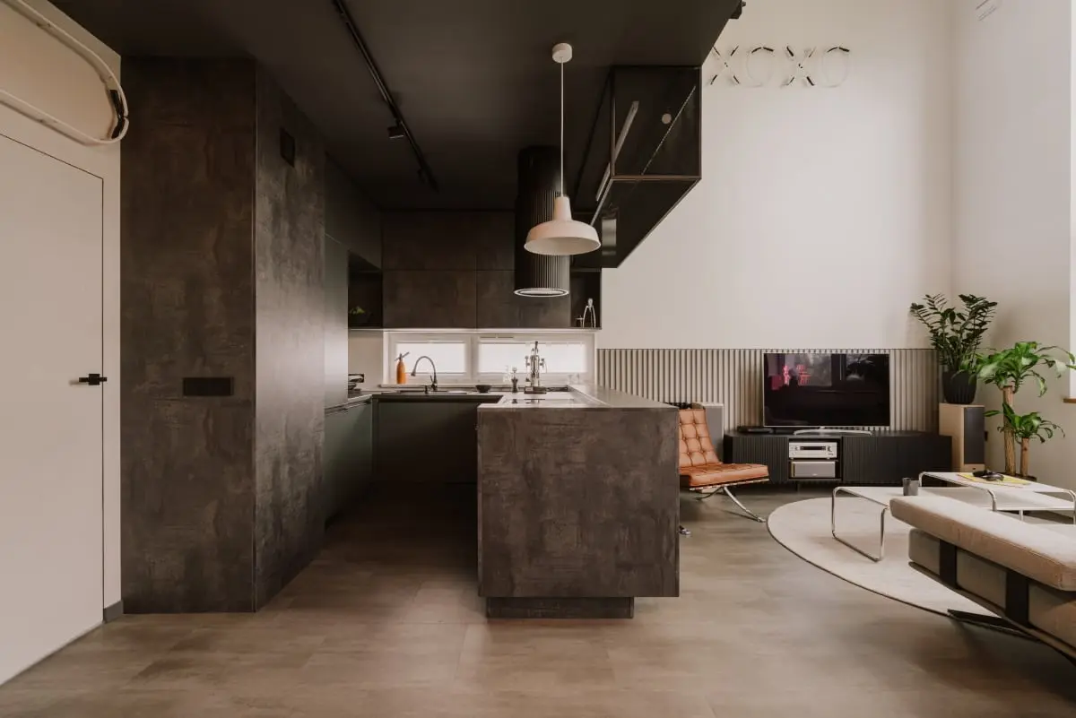 Prezentowane mieszkanie o powierzchni 94 m2 posiada spektakularną wysokość 5,5 m oraz antresolę, dzięki czemu od razu udało się uzyskać industrialny klimat. Architekt postanowił uwypuklić surowość i męski pierwiastek projektu, poprzez zastosowanie kontrastów czerni i bieli, przełamanych teksturą betonu i drewna oraz drobnymi akcentami kolorystycznymi. Marcin Cibor ograniczył paletę barwną we wnętrzu do monochromatycznego minimum, jednak postanowił zaszaleć w warstwie strukturalnej i fakturalnej. Wariacje na temat betonu pojawiają się jako podłoga winylowa, panele ścienne oraz tynk dekoracyjny. Z kolei czerń i grafit ukazują się jako malowane ściany czy laminat imitujący postarzany metal. Nie mogło również zabraknąć industrialnych, metalowych elementów, tj.: gięta blacha, która tworzy schody dywanowe na antresolę, barierki stalowe, lamele ścienne, skrzynie z siatki cięto-ciągnionej, czarne żeberkowe grzejniki czy szynoprzewody z reflektorami.