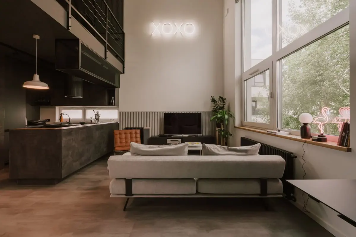 Aby wprowadzić więcej oddechu do mieszkania cała ta strefa jest negatywem dla przestrzeni kuchni – czyli mamy całą białą strefę z akcentami czerni i szarości. Bardzo ważną rolę spełniają ogromne okna, za którymi rosną piękne brzozy. W tej przestrzeni mamy drobne akcenty bauhausu w formie stolików kawowych oraz słynnego fotela Barcelona – który tutaj, również jest akcentem kolorystycznym. Biała ściana nad telewizorem stanowi również ekran pod rzutnik. Kompozycję tej ściany dopełnia charakterystyczny neon będący napisem XOXO.