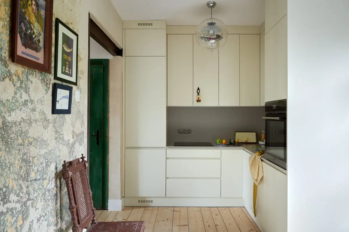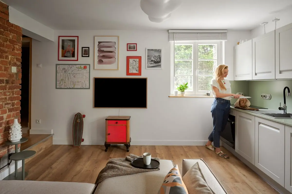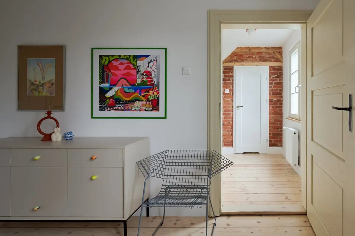 Na zewnątrz dom zachował się praktycznie w oryginalnym stanie, bo znajduje się pod opieką lokalnego konserwatora zabytków. W środku widać dużo współczesnej polskiej sztuki, rzeźby i meblarskie perełki z lat 80. Podczas remontu priorytetem było zachowanie jak największej ilości oryginalnych elementów domu, starych podłóg, czy wykusza w sypialni. Nawet parapety są zrobione z desek, które były wcześniej częściami okien. Większość mebli w domu pochodzi z drugiego obiegu, zachowała się także dawna stolarka. Zachwycają drewniane uchwyty – figurki w kuchni, stół pomocniczy zrobiony z płytek, płyty pilśniowej i koziołków, szklana rzeźba i sofa w salonie, odrapana ściana, powstała przypadkowo podczas remontu, czy żółte schody ciągnące się na poddasze.