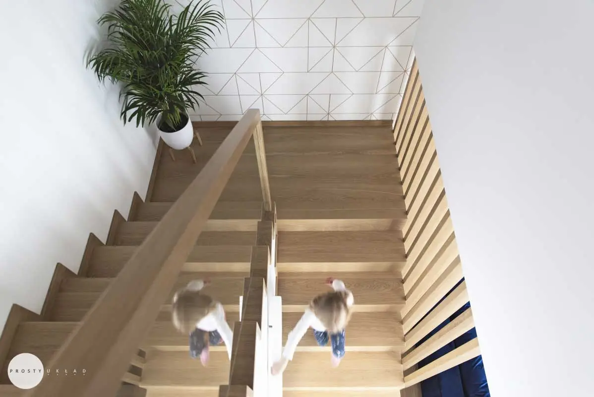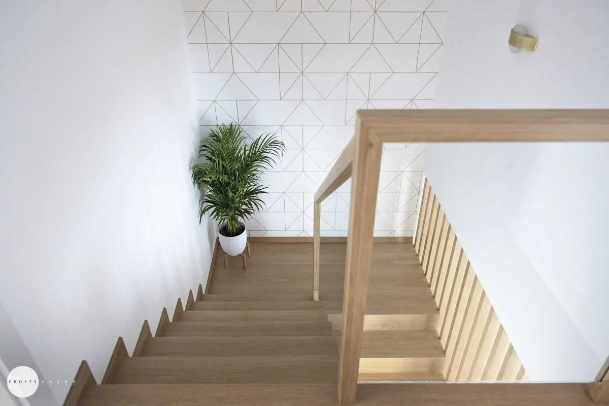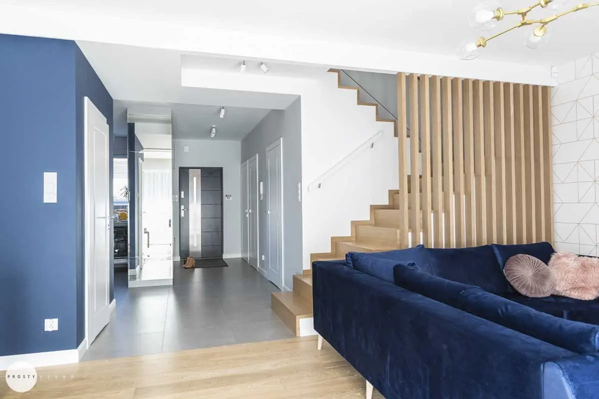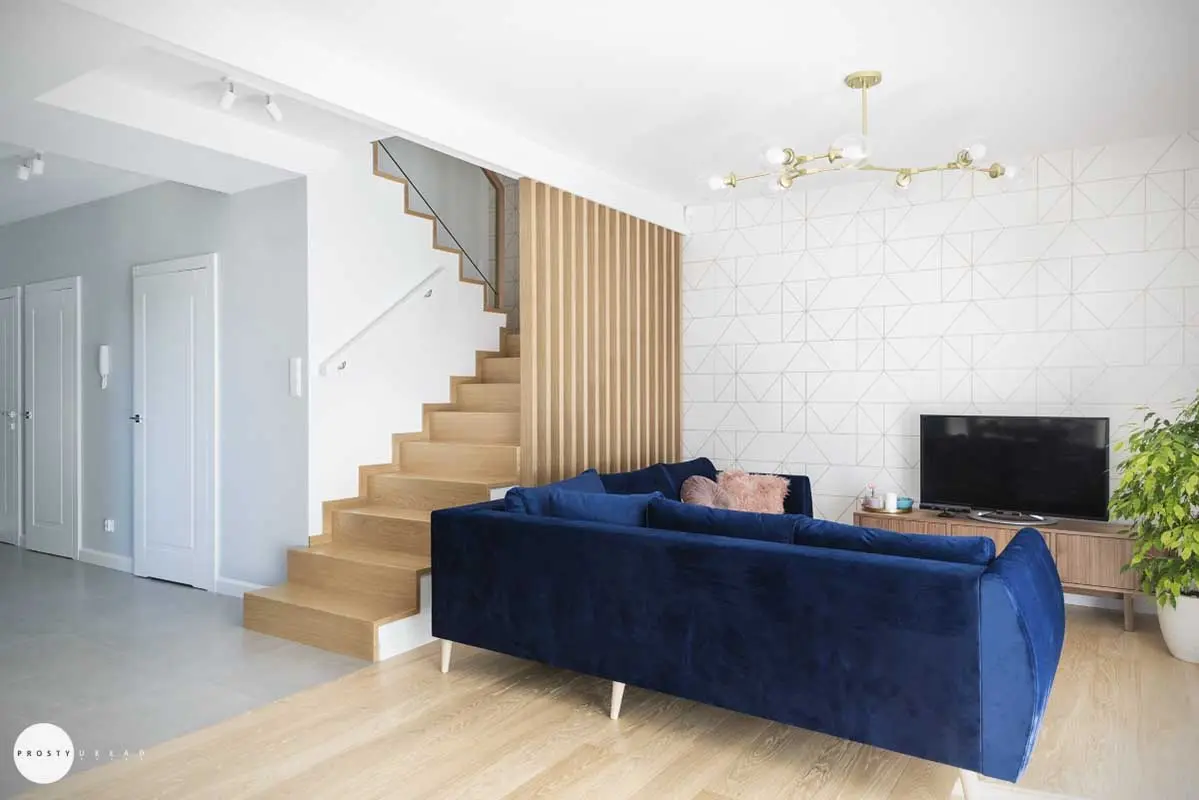 Parter domu to przestronna i jasna część dzienna z wydzieloną kuchnią. Strefy funkcjonalne zaakcentowane są, także przez zróżnicowane pokrycie podłogowe. Szare płytki znajdują się w korytarzu i kuchni, co stanowi bardzo praktyczne rozwiązanie. Natomiast w salonie przytulność wprowadzają jasne deski. Kolorem Classic Blue pokryto, oddzielającą salon od kuchni ściankę, która dodatkowa ozdobiona jest listwami sztukateryjnymi. Kolejnym elementem w błękitnym kolorze jest welurowy narożnik wprowadzający klimat glamour. Nad nim zawisła ciekawa lampa w złotym wykończeniu. Akcentem uzupełniającym kierunek aranżacji, jest tapeta na ścianie telewizyjnej. Delikatne złote linie, nawiązują do Art deco.