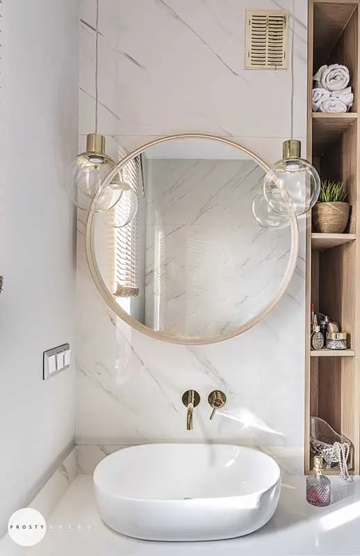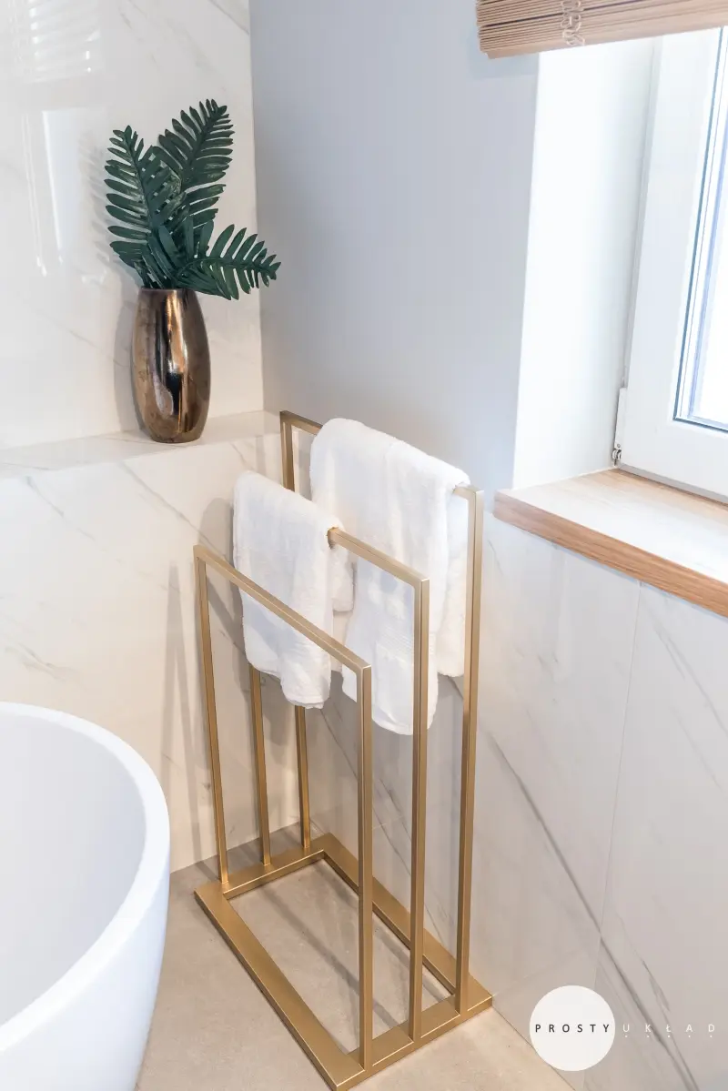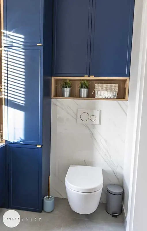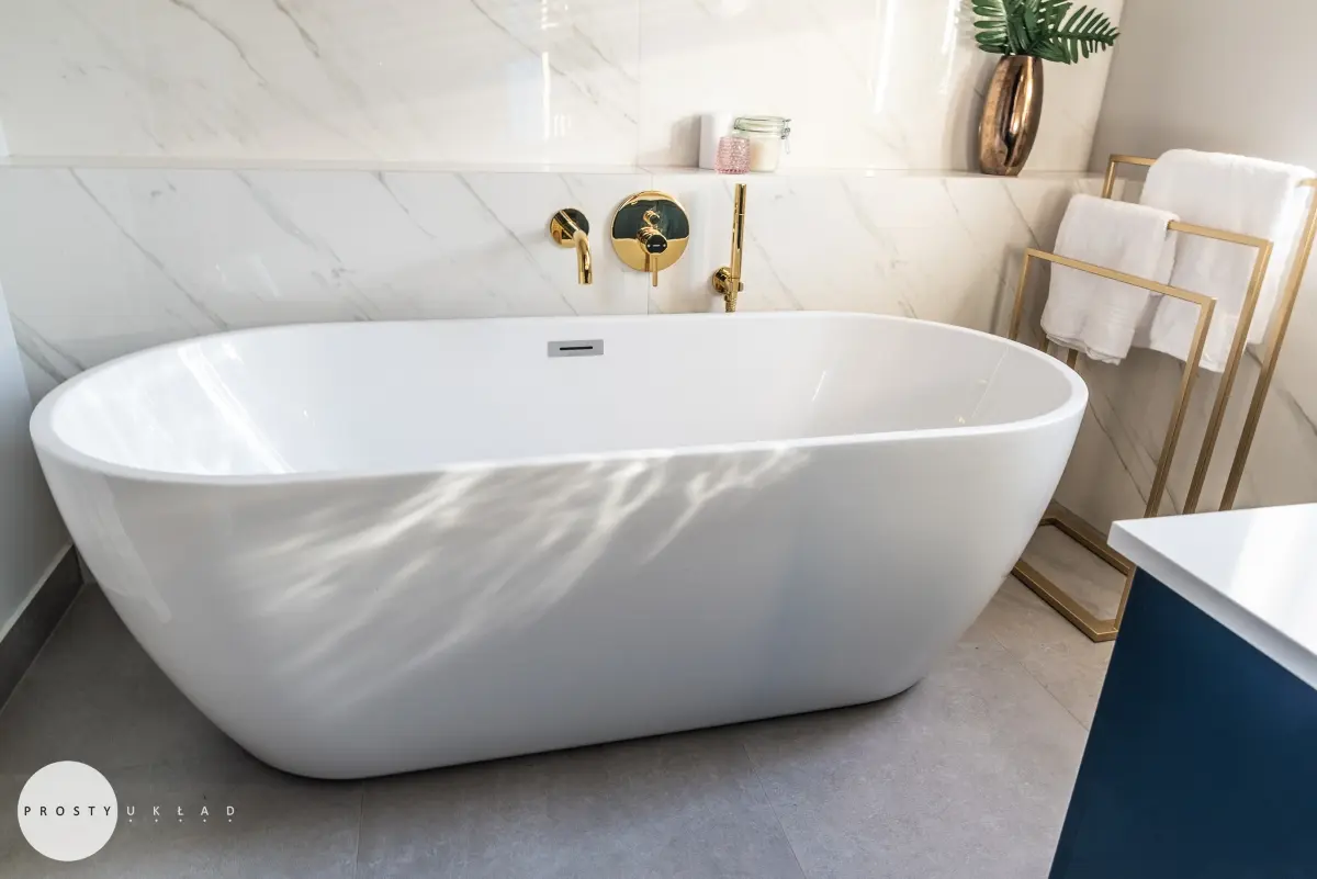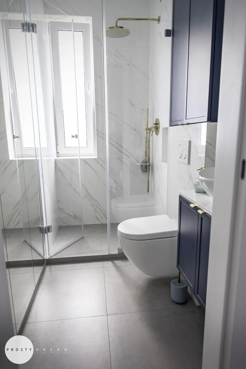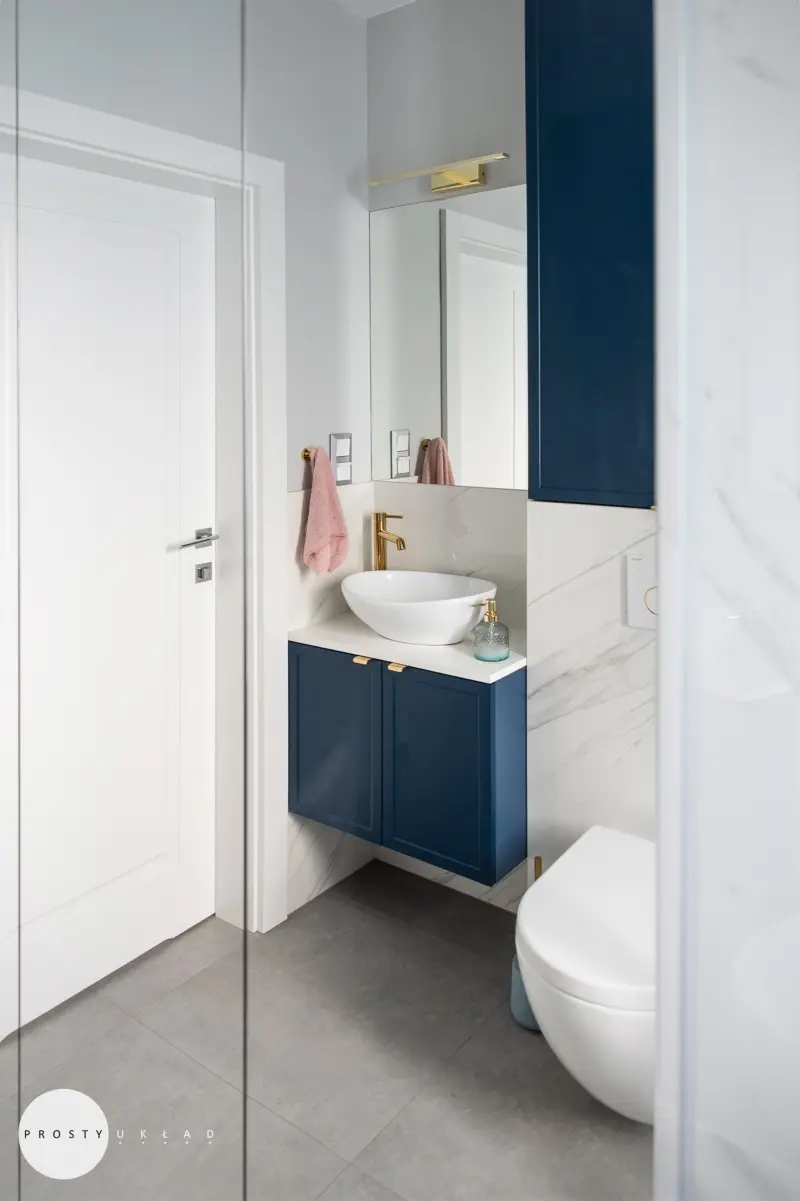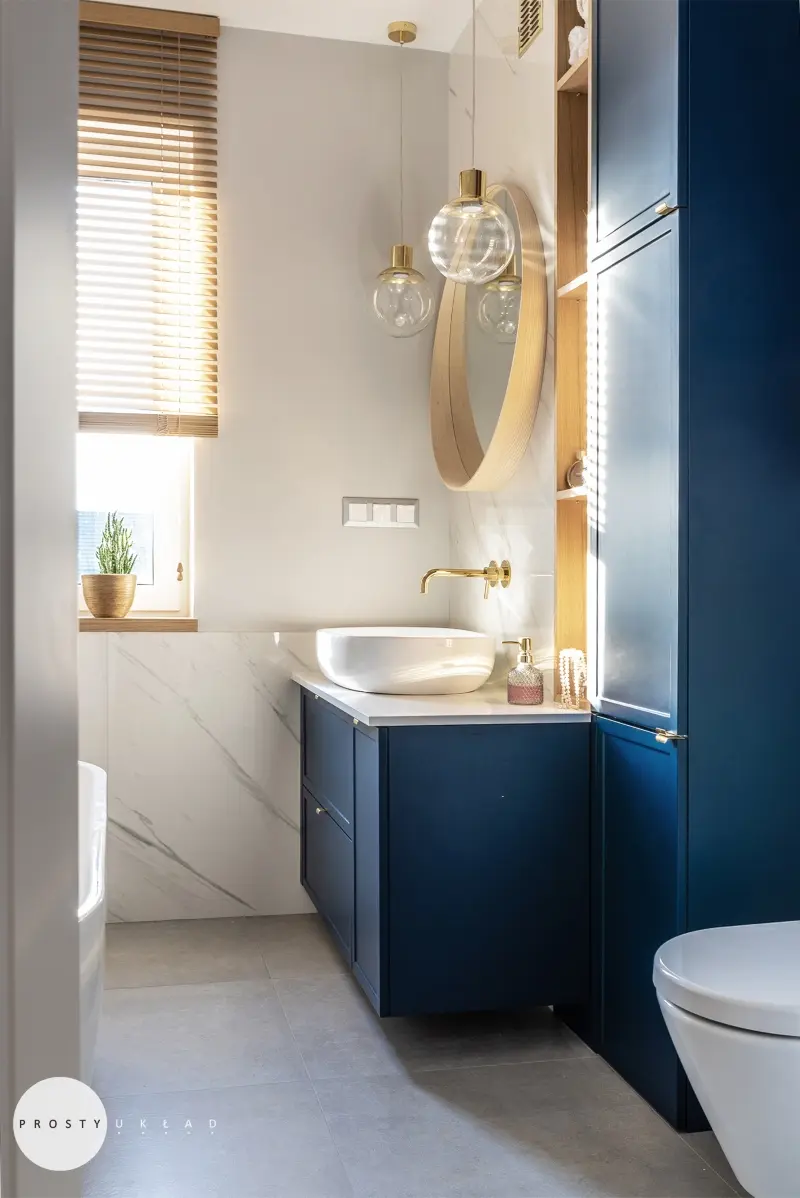 Styl z części dziennej przeniesiono również do łazienek. Aranżacja tych pomieszczeń jest spójna z wizją architektów i króluje tutaj marmur, akcent w kolorze Classic Blue oraz złote dodatki. Podłogi pokrywa szary gres, a ściany płytki o teksturze marmuru. Całość uzupełnia granatowa zabudowa z frezowanymi frontami. Subtelną elegancje, charakterystyczną dla projektu, podkreśla złota armatura oraz uchwyty szafek. Dzięki tym zabiegom powstały prawdziwe salony kąpielowe, w których z przyjemnością można się zrelaksować po długim dniu.