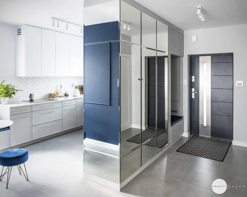 Szlachetny odcień błękitu stanowi idealne tło dla aranżacji wnętrz. Po pierwsze dlatego, że należy do grupy neutrali, a po drugie wprowadza poczucie spokoju i równowagi. Jest również znakomitym wyborem dla aranżacji inspirowanych stylem glamour, gdyż już nawet w niewielkich akcentach, nadaje klimatu subtelnej elegancji. Właśnie taki zestaw dominuje w domu, którego wnętrze zostało zaprojektowane przez pracownię Prosty Układ. Aranżację wzbogaca marmur, złote dodatki oraz akcent barwny w postaci pudrowego różu. Rezultatem jest minimalistyczny glamour z dużą ilością Classic Blue.