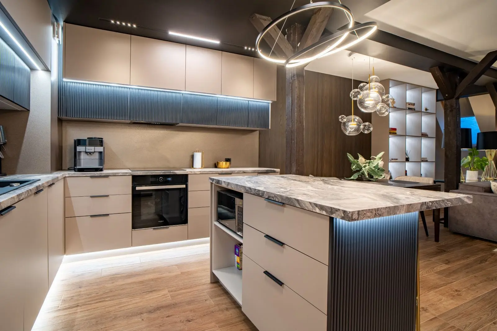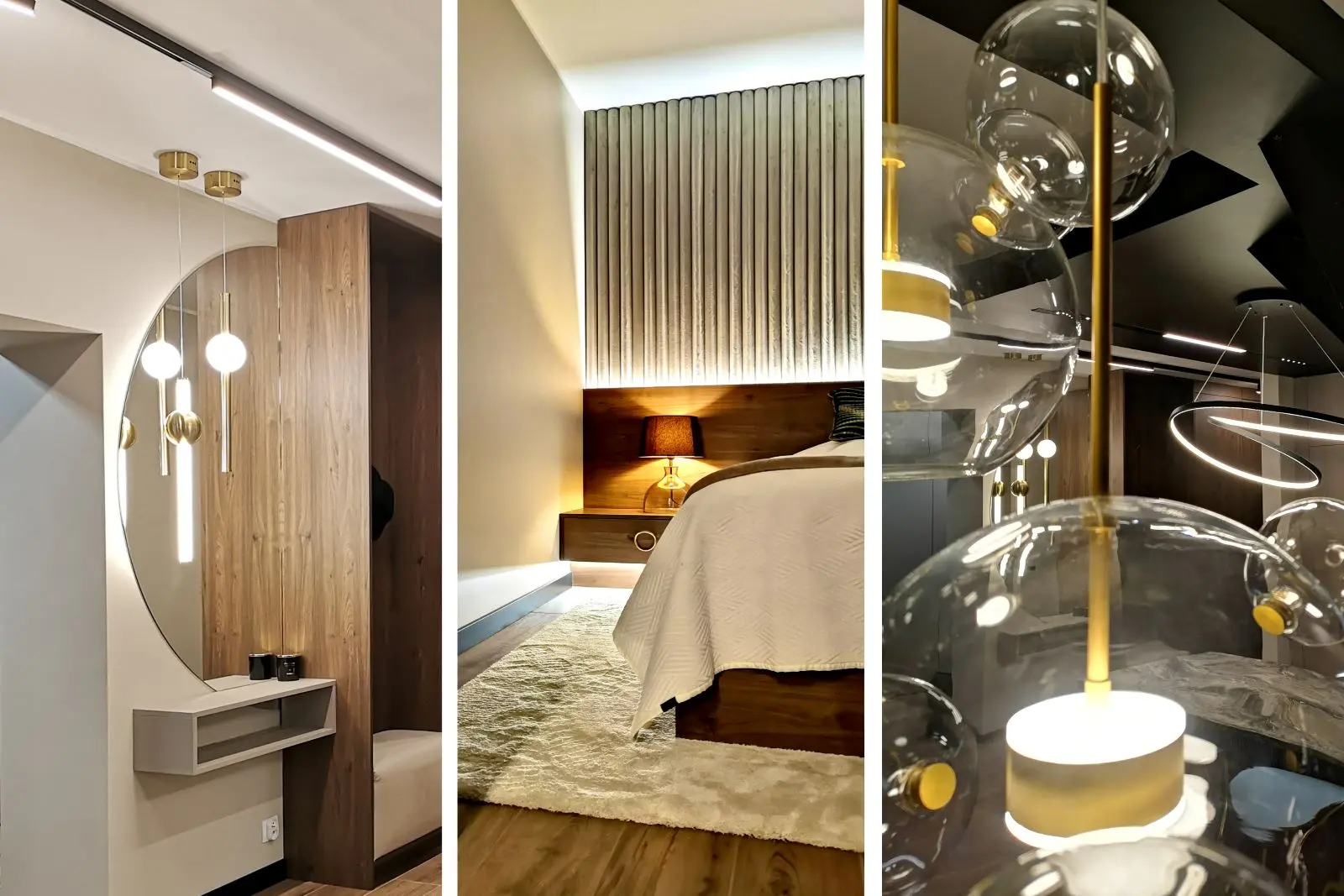 Bardzo ważną rolę we wnętrzach z ciemną oprawą jest starannie dobrane oświetlenie. W tych wnętrzach postawiono na ukryte źródła światła, ale i widoczne ozdobne lampy, które stanowią elementy przyciągające uwagę. Ciepłe, miękkie światło tworzy kontrast z ciemnymi kolorami, co nadaje wnętrzu ciepło i przytulność. Dodatkowo przy połączeniu ryflowanych frontów z ukrytym światłem, wnętrze zyskało dynamikę i głębię.