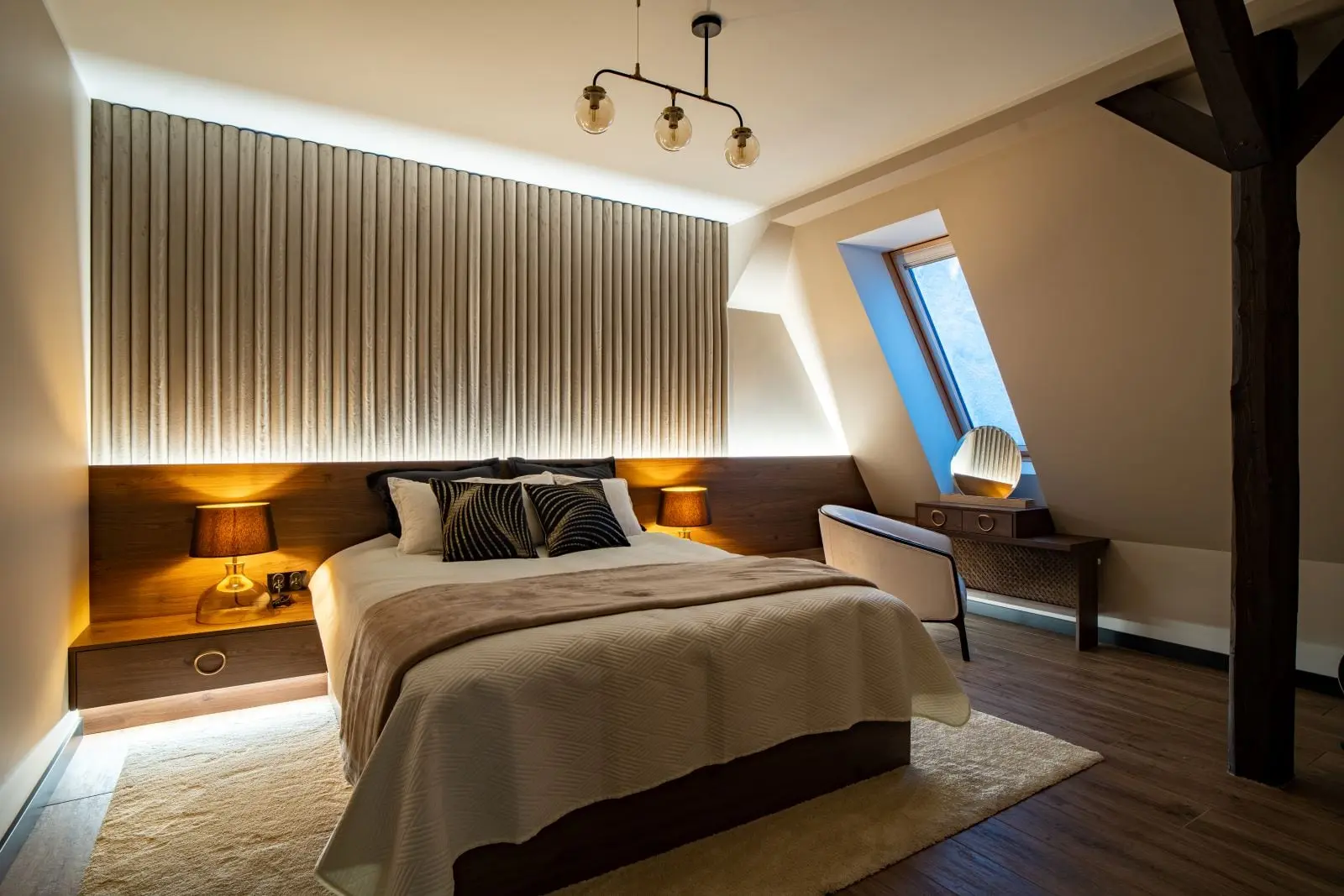 Styl Dark Living jest często określany jako minimalizm z luksusem. Choć wydaje się być prosty i ascetyczny, to właśnie w tych szczegółach tkwi bogactwo tego stylu. Minimalistyczne meble i prostota formy tworzą doskonałą oprawę dla luksusowych tkanin, materiałów i dodatków. W sypialni zależało architektom na prostych formach, ale ważne też było, aby wnętrze stało się przytulne. Prawie całą ścianę pokryto półwałkami wykończonymi welurem. Podłogę ocieplił miękki dywan a oprawa łóżka i miękki tapicerowany fotel magnetycznie przyciągają zmęczonych domowników po długim ciężkim dniu.