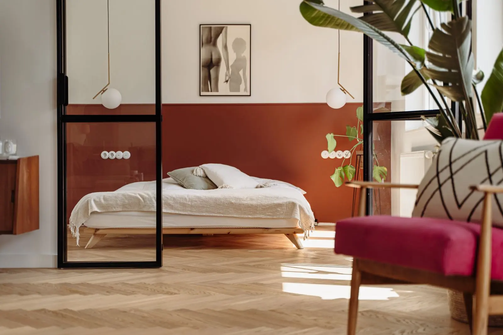 Architektki chciały optycznie powiększyć mieszkanie dlatego, aby wydzielić strefy między strefą dzienną a sypialnią wybrano szklane drzwi w czarnej ramie. W sypialni znajduję się duże minimalistyczne łóżko, a po obu stronach, zamiast małych lampek do czytania, zawieszono klasyki designu lampy Flos. Tu również jest dużo roślin, a bordowa lamperia dodaje stylu i ciepła do wnętrza.