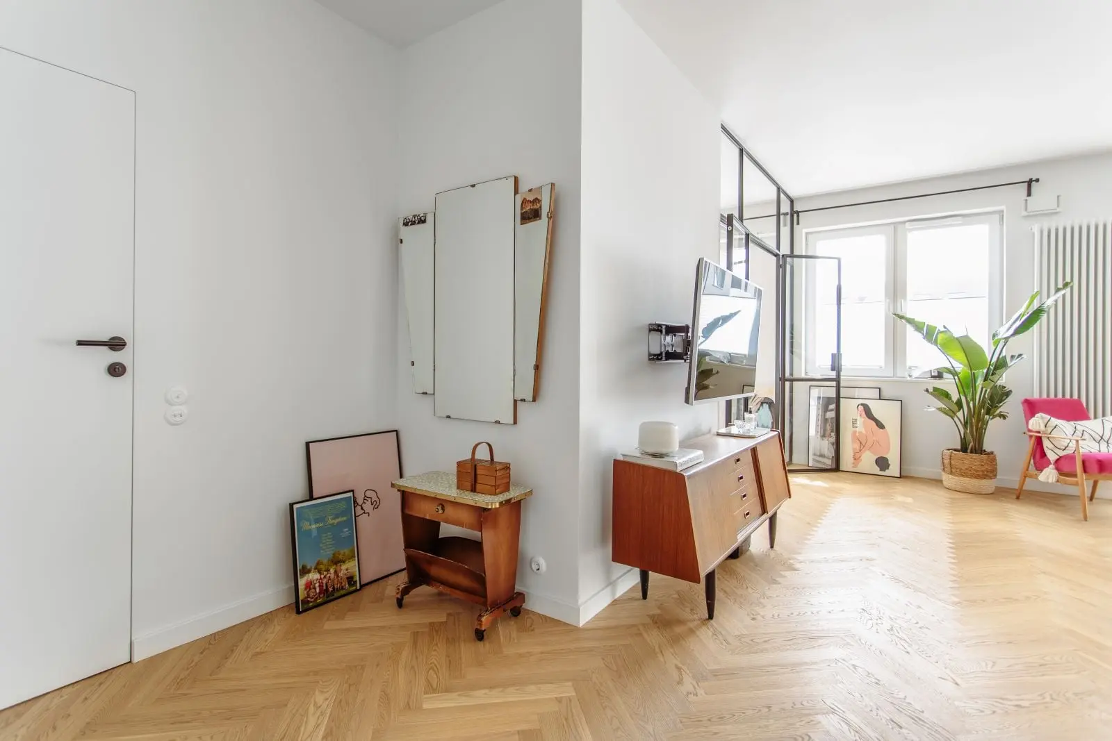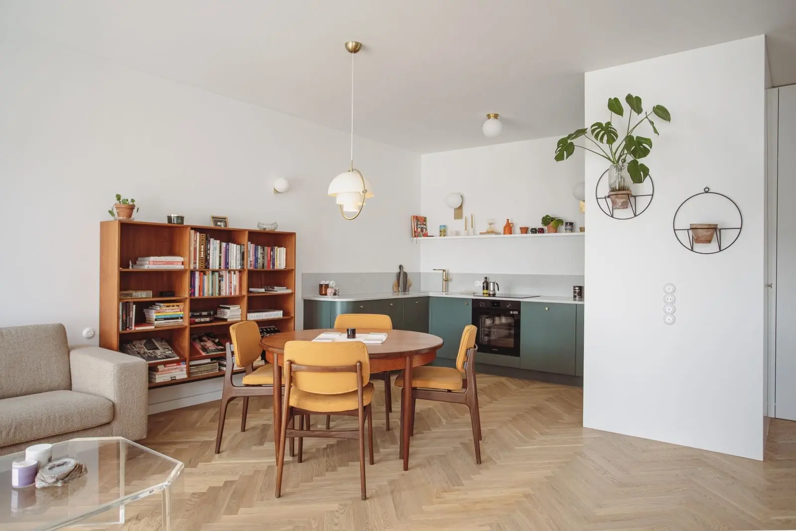 Właścicielka 50 metrowego mieszkania zakochana w designu z lat 70. zgłosiła się do Marii Biegańskiej oraz Eweliny Pik z pracowni Modullar o pomoc w nowej aranżacji lokum. Najważniejszym założeniem projektowym było to, aby wnętrze miało wyrazisty charakter. W efekcie powstało odważne wnętrze, pełne koloru, proste i funkcjonalne. Fascynacja polskim i skandynawskim designem z dawnych lat jest tu wyraźnie widoczna. Mamy tu lastryko oraz meble z dawnej epoki.