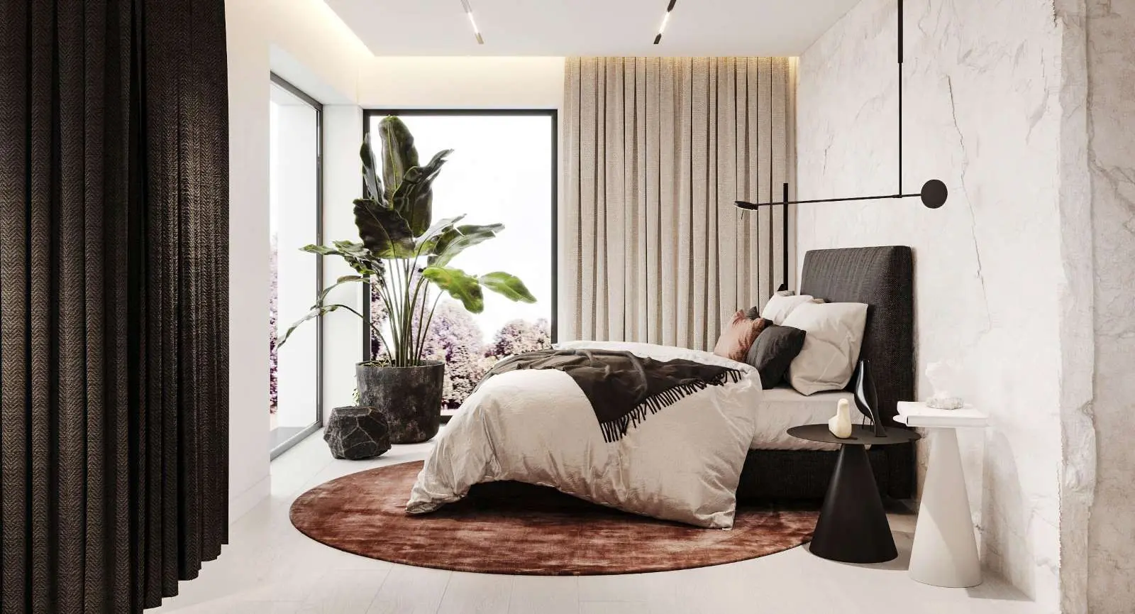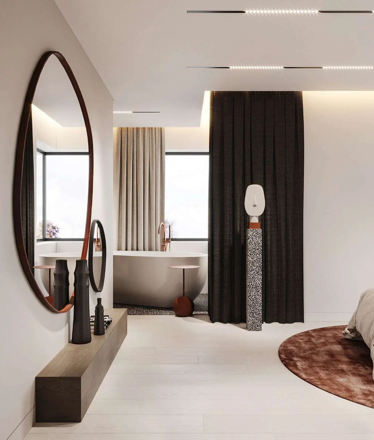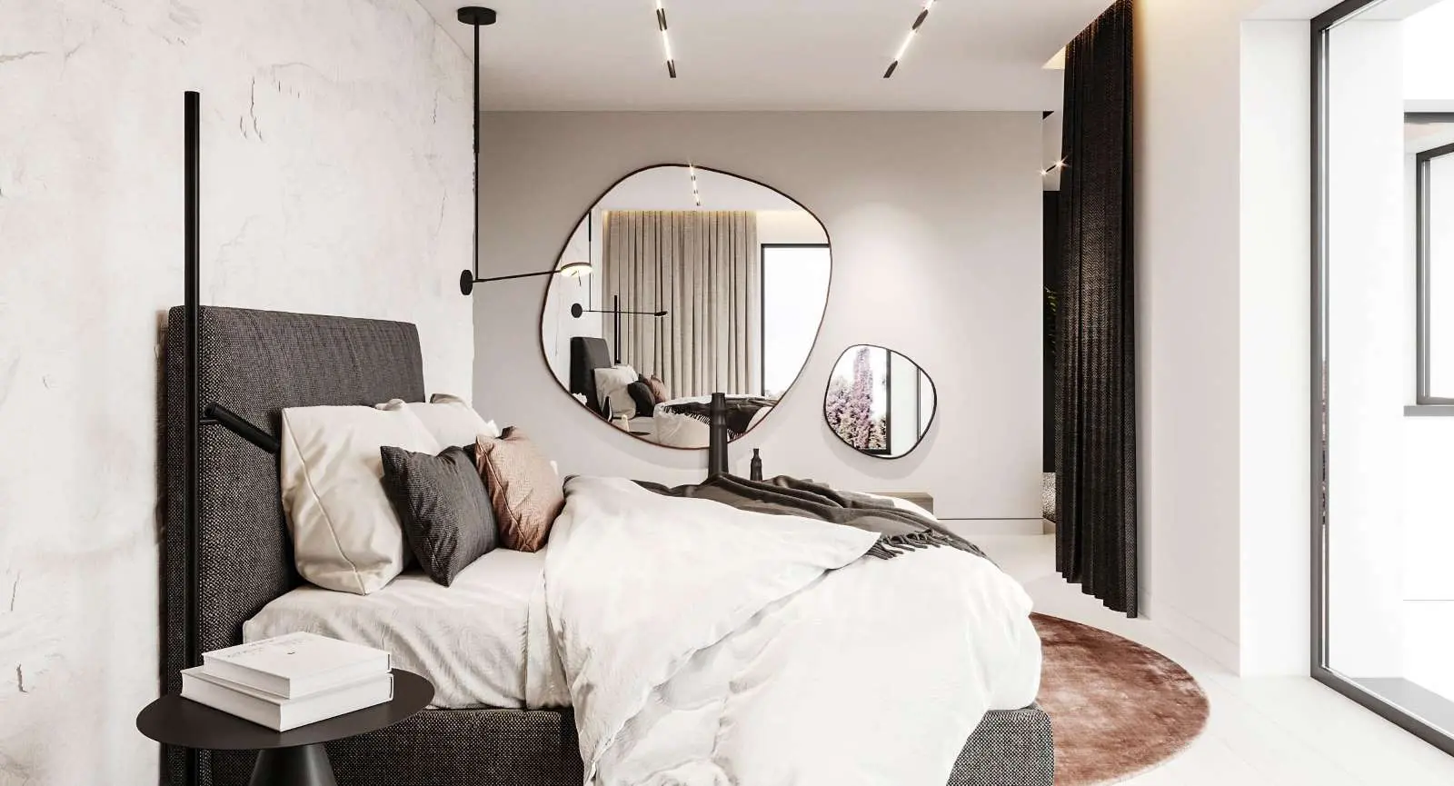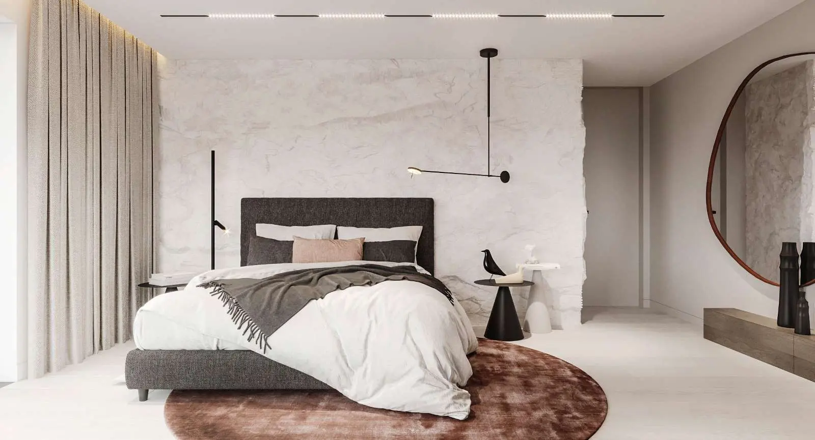Właściciele mają do swojej dyspozycji prywatny azyl, w którym prócz sypialni znajdują się też częściowo na nią otwarta łazienka oraz garderoba. Strefa nocna, dzięki narożnemu oknu, w ciągu dnia jest przepełniona naturalnym światłem. Odbijające promienie ogromne lustro o nieregularnej formie jest funkcjonalne i ozdobne. Kompozycję dopełnia drugie, mniejsze. Nierównomierny kształt luster, budzący skojarzenia z organicznymi formami, jest bliski naturze. Inspiracje naturą odnaleźć można także w tkaninach zasłonowych o wzorze plecionki. Efekt naturalnej skały uzyskano na ścianie za łóżkiem, którą pokrywa tynk strukturalny. Monumentalny kształt mebla do spania przełamuje okrągły dywan w kolorze karmelowo-bordowym. Oświetlenie w strefie snu zróżnicowano. Jedną z dwóch minimalistycznych lamp jest sufitowa oprawa firmy Grok.