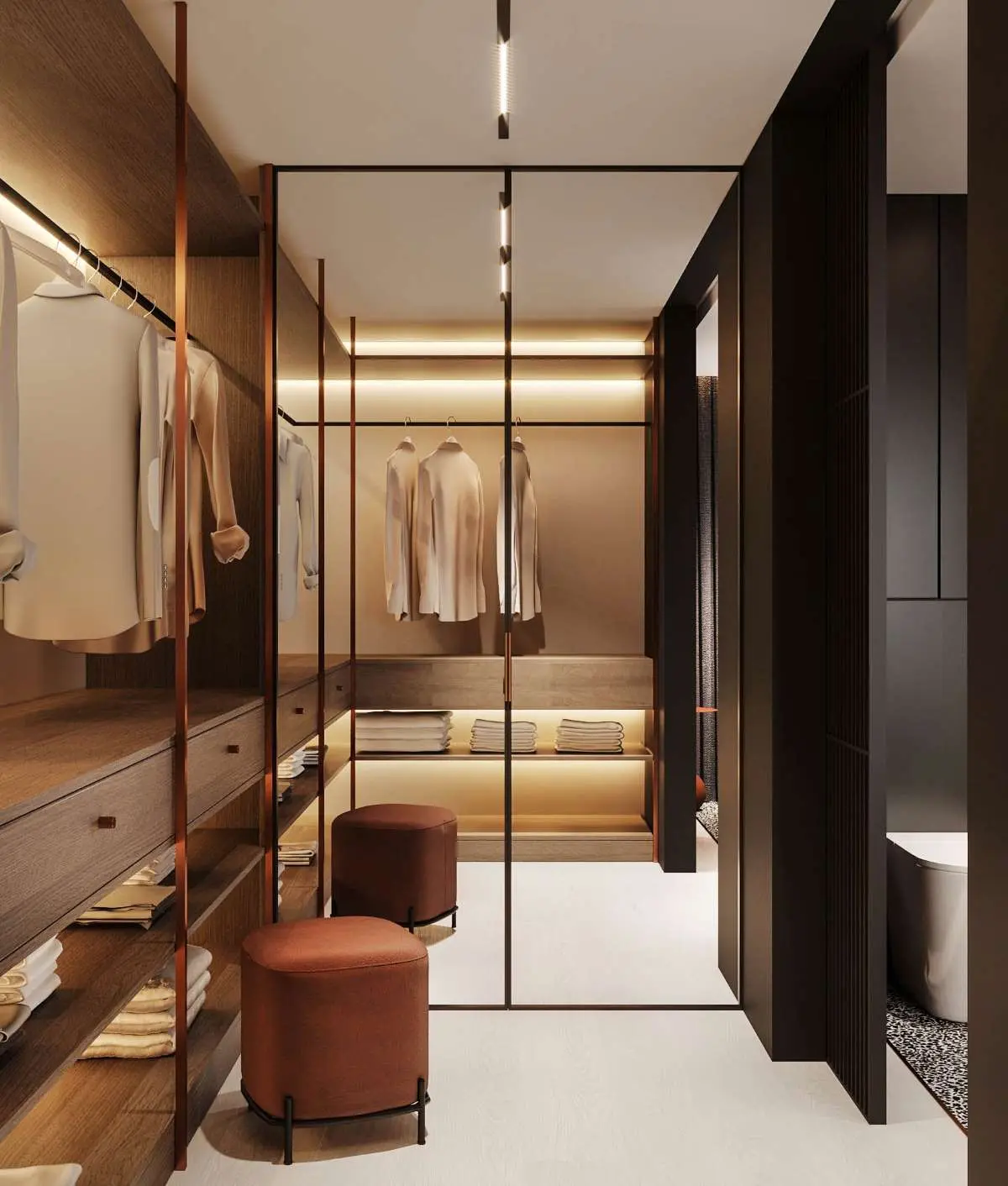 Do sąsiadującej z łazienką garderoby prowadzą stalowo-szklane drzwi przesuwne, które dzięki częściowej przezierności podkreślają związek między obydwoma wnętrzami. Garderoba jest maksymalnie uproszczona, dzięki czemu wydaje się jeszcze bardziej przestronna. Optyczne powiększenie potęgują, ujęte w czarne ramy, lustrzane fronty zabudowy. Pozostałe wyposażenie stanowią drążki, szuflady i półki. Miedziane profile, będące konstrukcyjnym podparciem dla półek, pełnią również funkcję dekoracyjną. Oświetlenie – liniowe i systemowe – jest użyteczne i wydobywa urodę przestrzeni garderoby.