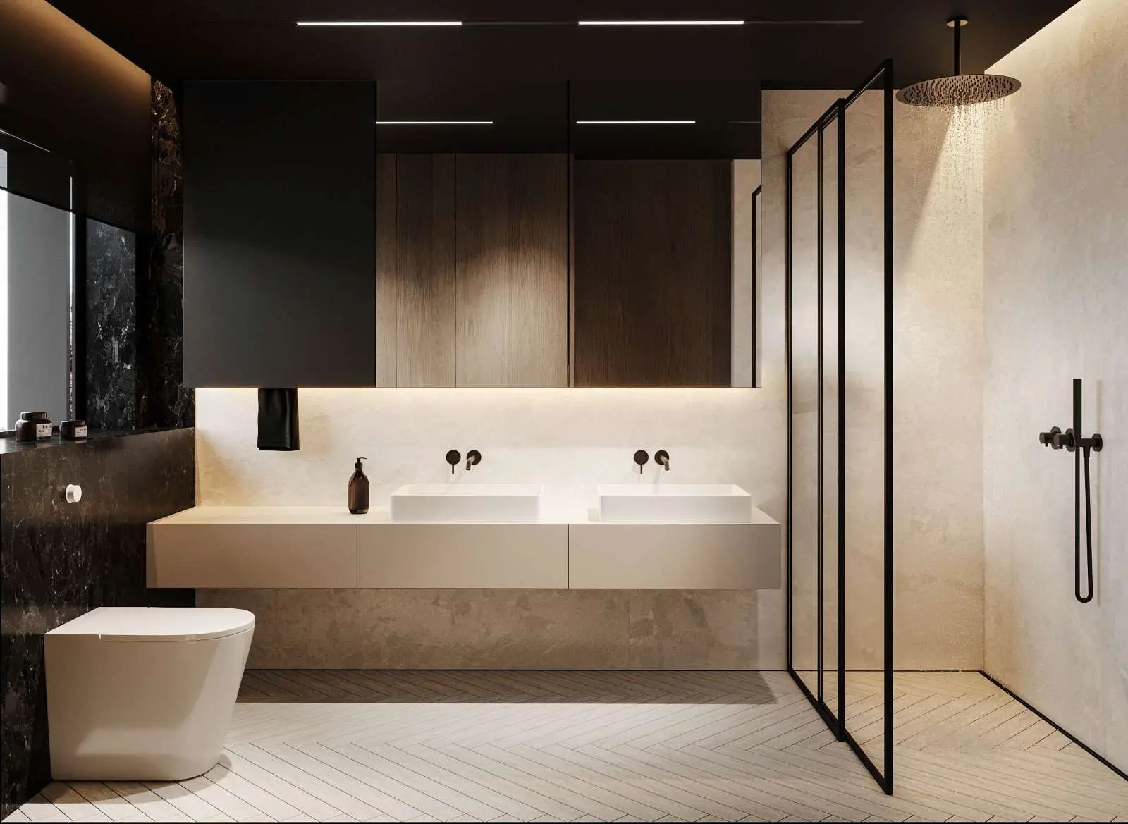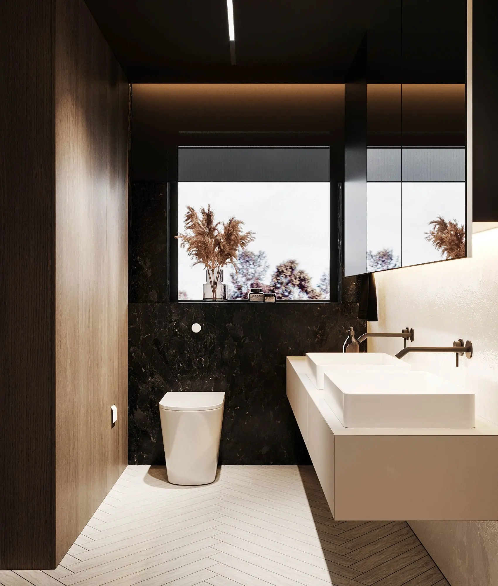 – Inwestorzy obawiali się czarnego sufitu myśląc, że obniży optycznie wnętrza. Niesłusznie – wyjaśnia Paweł Łęczycki z Modeko.Studio. Czerń sufitu współgra tu z czarnymi elementami w strefie prysznicowej, wydzielonej drzwiami przesuwnymi, w której przyjemność kąpieli zapewnia deszczownica sufitowa marki Axor, z której oferty wybrano całą armaturę w tym wnętrzu. Czarny sufit jest obniżony. Dzięki temu po dwóch stronach łazienki powstały wnęki na oświetlenie, a od strony okna przestrzeń, w której zamontowano system rolety okiennej mającej tę samą szerokość co ściana. Strefę umywalkową tworzą: umywalki nablatowe firmy Kaldewei z szafką podwieszaną wykonaną na zamówienie ze spieku kwarcowego. Nad umywalkami przewidziano dodatkowe miejsce do przechowywania. Szafka ma celowo obniżony front, którego dolna część pełni funkcję uchwytu.