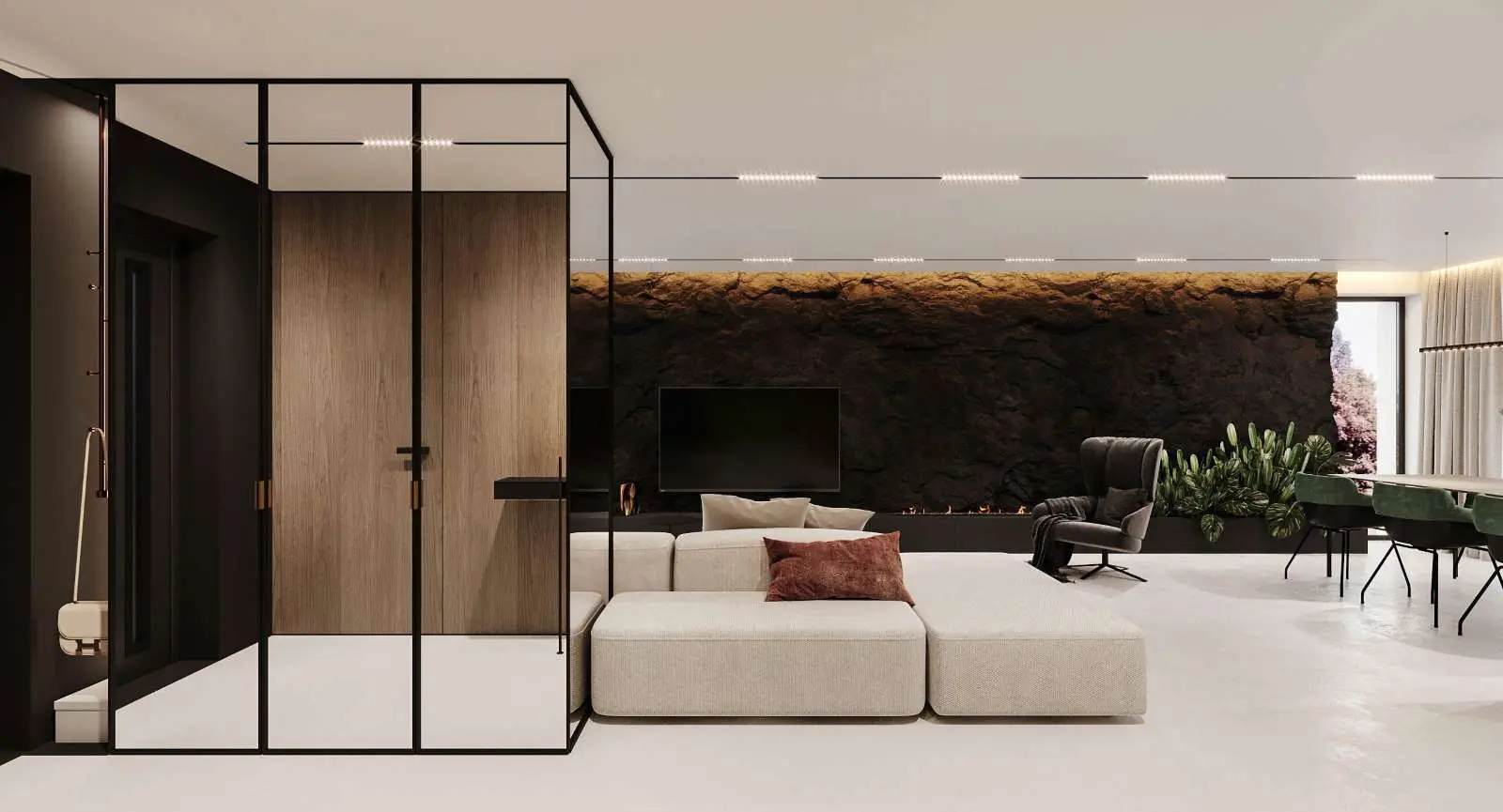 Reprezentacyjny charakter strefy wypoczynkowej salonu uwypukla spektakularna ściana pokryta dekoracyjnym tynkiem oddającym strukturę skały. Dzięki takiemu wykończeniu płaszczyzna ma walor rzeźbiarski i jednocześnie budzi skojarzenia z naturą. Odnosi się wrażenie, jakby dom był w nią wtopiony, wkomponowany w skaliste zbocze, które przecina. Wzdłuż strukturalnej ściany, na której wisi telewizor, wpisujący się w czerń płaszczyzny, przez to nazbyt się z niej niewyróżniający, zaplanowano multifunkcjonalną niską zabudowę meblową. Relaksowi przy kominku sprzyja fotel „Cut & Soft” firmy Ditre Italia, a domowym seansom telewizyjnym bądź posiedzeniom przy kawie w gronie rodziny lub przyjaciół wygodna sofa, która zaprasza do wypoczynku już od wejścia do domu.