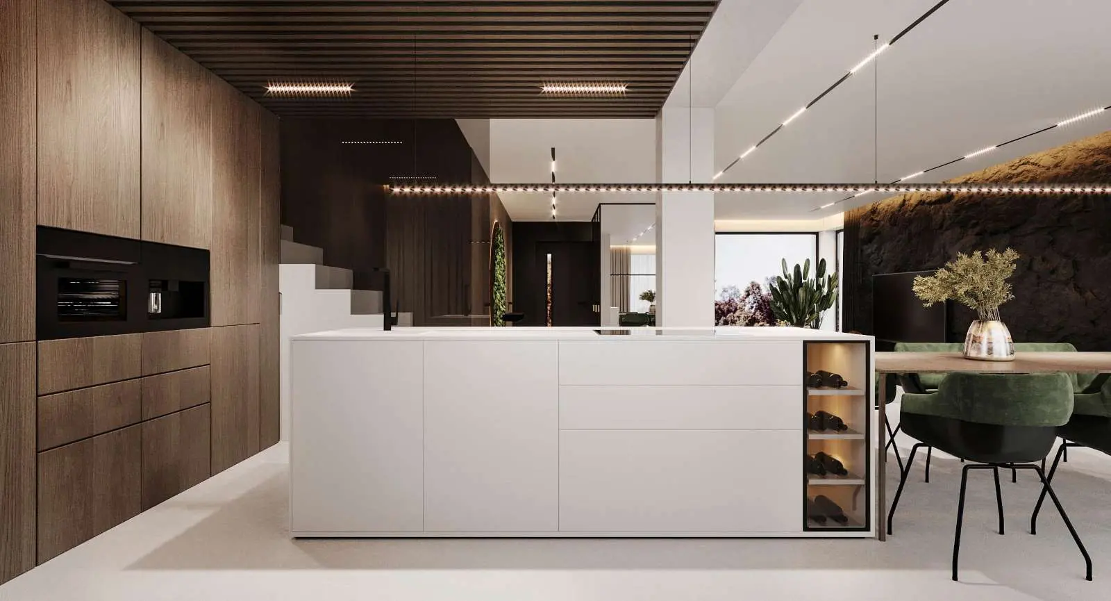 Pokryte tym samym fornirem fronty skrywają lodówkę, zamrażarkę i przestrzeń do przechowywania. W zabudowie przewidziano także ekspres do kawy i piekarnik. Intrygującym elementem, który spaja wykończoną drewnem zabudowę z wyspą są zawieszone pod sufitem drewniane lamele, pomiędzy którymi zamontowane jest systemowe oświetlenie rozświetlające strefę przygotowywania posiłków. Ozdobny sufit wydziela przestrzeń kuchni i czyni ją bardziej przestrzenną. Umowne granice w otwartej strefie dziennej wyznaczają także słup i biegnąca w stronę okna belka. Te elementy konstrukcyjne celowo nie są ukryte, lecz wręcz podkreślone poprzez pokrycie ich tynkiem strukturalnym bardzo zbliżonym wyglądem do betonu na posadzce. Identyczny materiał wykorzystano do wykończenia schodów.