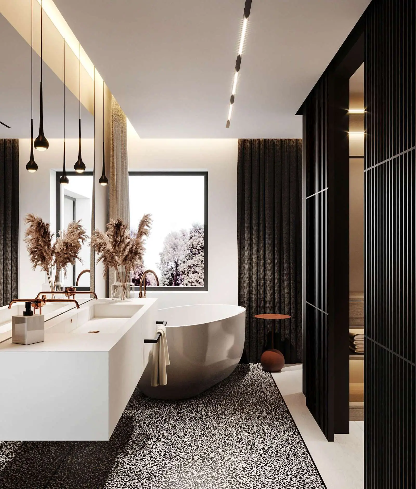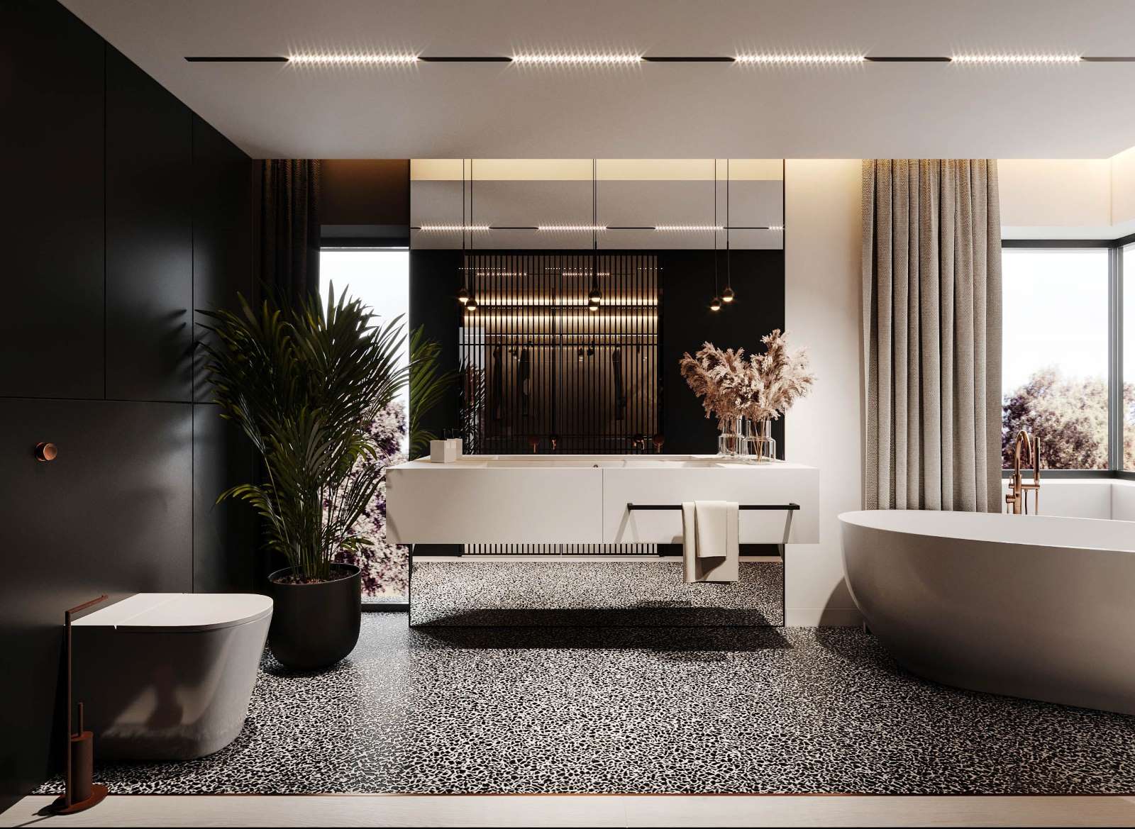 Konsekwencja w aranżacji łazienki właścicieli widoczna jest już od wejścia. Ponieważ pokój kąpielowy stanowi z sypialnią i garderobą jedną strefę, podłoga z sypialni „wchodzi” do łazienki, gdzie łączy się miedzianą listwą z posadzką z naturalnego lastryko. Spójność wnętrz podkreśla także czarna ściana na wprost wejścia – zabieg stosowany w wielu pomieszczeniach domu. Miedź w wystroju łazienki została użyta bardzo konsekwentnie – w kolorze miedzi jest także armatura marki Axor. Umywalkę, zintegrowaną z szafką, wykonano na zamówienie ze spieku kwarcowego. Lustrzana ściana za nią optycznie powiększa wnętrze. Wanna, ustawiona lekko skośnie, przełamuje regularny rytm kompozycji i „wychodząc” na sypialnię podkreśla jedność obu przestrzeni. Za wolnostojącą wanną, w przestrzeni między nią a oknem, przewidziano wygodną, podwyższoną półkę na kosmetyki do kąpieli.