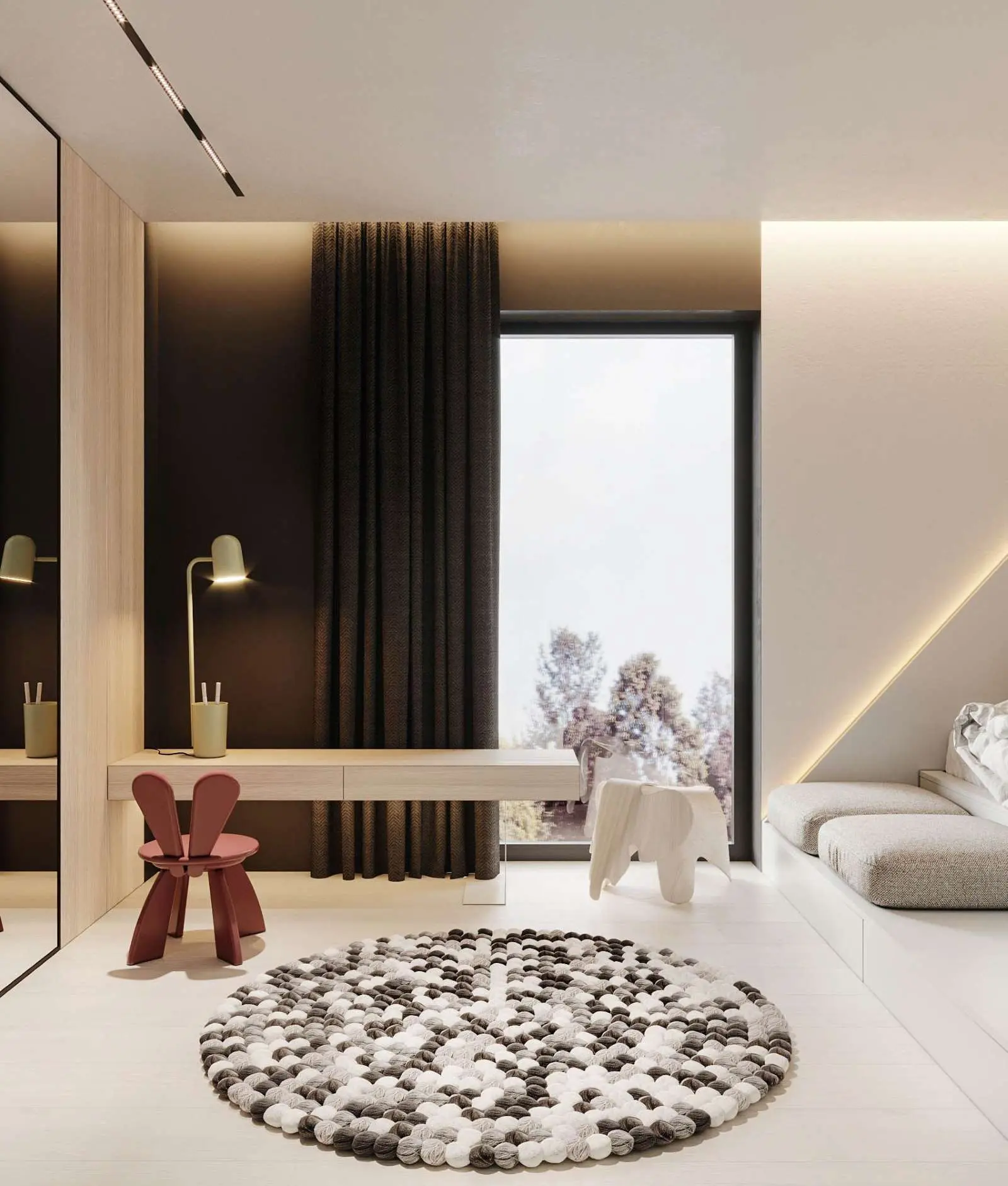 Dziecięca sypialnia to jedyne pomieszczenie, w którym zostało użyte do wykończenia jasne drewno – bielony dąb. Pokój został zaprojektowany tak, że będzie „rósł” razem z małym domownikiem. Biurko, którego wysokość można regulować, posłuży synowi właścicieli także za kilka lat. W meblowej zabudowie chłopiec obecnie przechowuje zabawki i książki, ale w przyszłości mebel pomieści wszystkie skarby nastolatka. Lustrzane fronty szafy powiększają optycznie wnętrze. Nawet w pokoju dziecka nie zabrakło charakterystycznej dla całego domu czerni. Ściana na wprost wejścia, pomalowana w tym kolorze, wydaje się monumentalna mimo, że otwór okienny nie jest na całą jej wysokość. Radosne nuty w sypialni chłopca wprowadza zgaszona zieleń drzwi i ścianki wspinaczkowej. Wykonane na zamówienie łóżko na podeście to tajemnicza wyspa, miejsce odpoczynku, zabawy, ale także przechowywania, bo w podeście przewidziano szuflady-skrytki. Podświetlone trójkąty w narożniku strefy snu to dynamiczny geometryczny element, który przyciąga uwagę w uspokojonej jasnymi barwami przestrzeni.