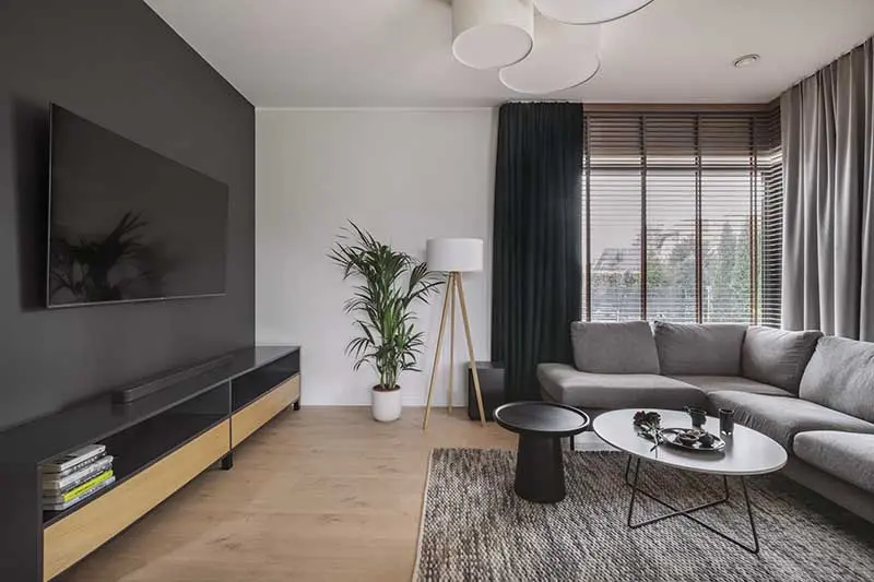 Kolor biały oraz czarne detale płynnie przechodzą do kolejnych pomieszczeń. W salonie komponują się z tapicerowanymi meblami utrzymanymi w odcieniach szarości. Ciężkie zasłony oraz drewniane żaluzje powodują, że wnętrze salonu szybko może zamienić się w salę kinową, która była marzeniem klienta.
