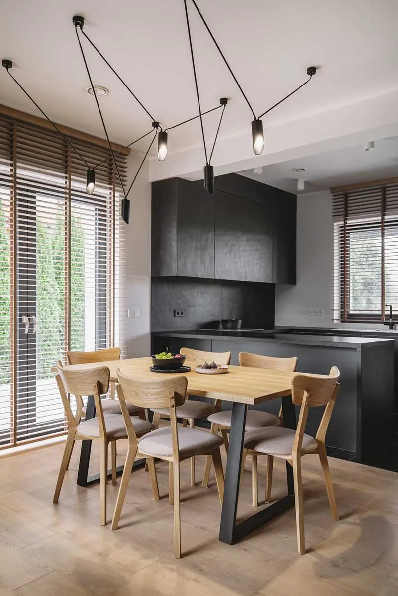 Stół jadalniany stojący w sąsiedztwie półwyspu kuchennego wykonany z naturalnego drewna oraz metalu ociepla surowy klimat kuchni.
