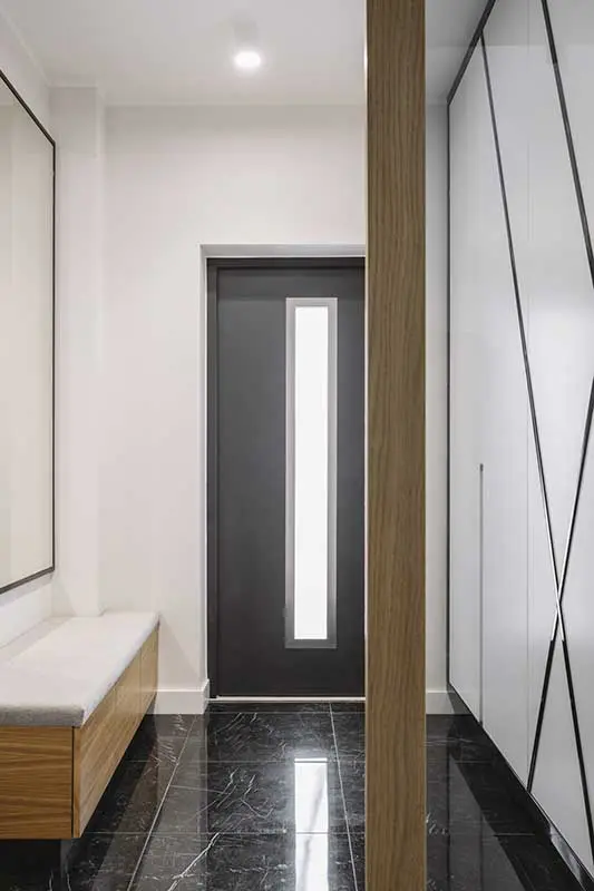 Do mieszkania prowadzi przedsionek, w którym króluje podłoga z wzorem kamienia, jasne szafy oraz drzwi suwane pełnej wysokości pomieszczenia, które powodują że przestrzeń wydaje się większa. Wykonane na zamówienie drzwi i zabudowa stolarska pokrywają niemal całe ściany, skrywając niezbędną przestrzeń przechowywania.