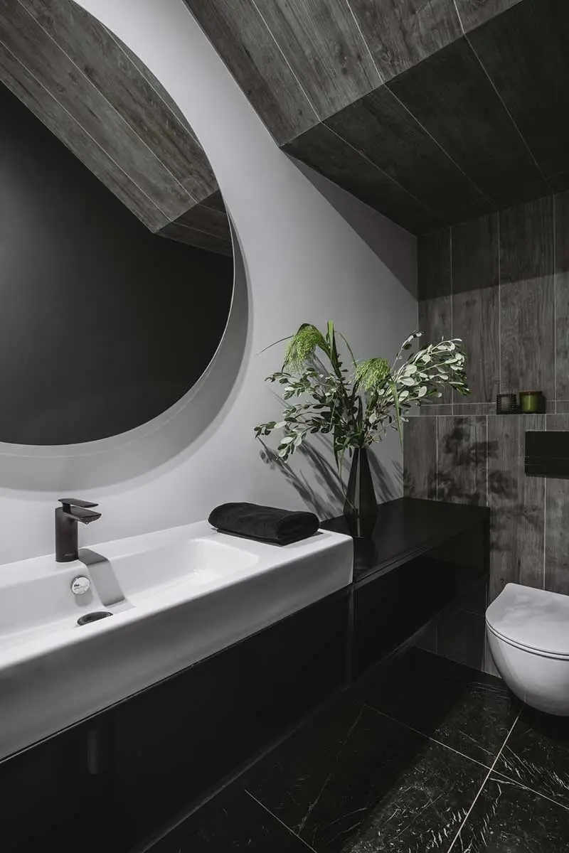 Na parterze domu znajduje się również niewielka łazienka z łaźnią parową. Tutaj zagościł prawdziwie męski charakter. Materiały wykorzystane w tym wnętrzu to kafle wielkoformatowe z wzorami surowego drewna oraz kamienia.