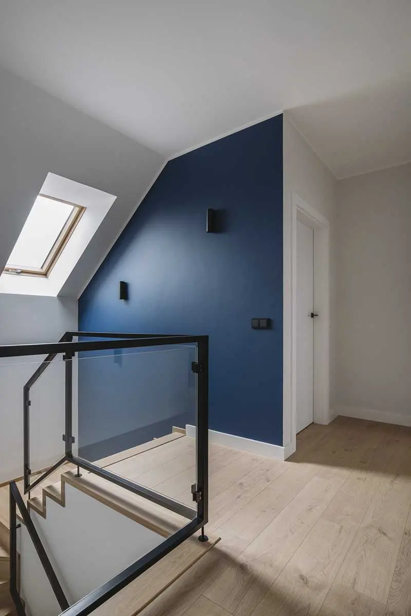 Wyjątkiem i zarazem akcentem kolorystycznym jest granatowa ściana na piętrze domu. Korytarz prowadzi do drugiej łazienki oraz trzech sypialni. Przestrzeń ta zachowana jest w odcieniach bieli, która pojawia się na ścianach i drzwiach wejściowych do pokoi.