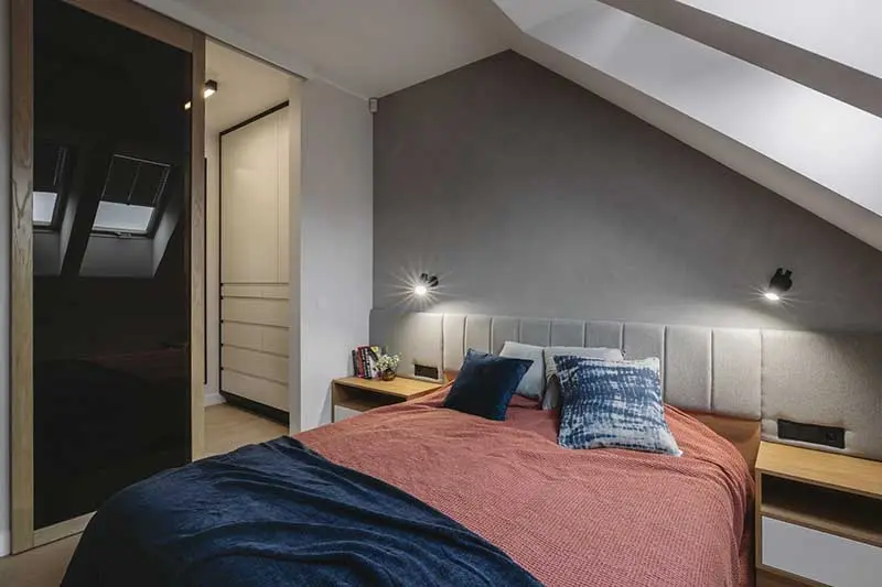 Sypialnia to wnętrze, w którym pojawia się najwięcej koloru, choć baza tego projektu opiera się na prostych i stonowanych rozwiązaniach. Betonowa ściana za telewizorem oraz na wezgłowiu łóżka, przełamana miękkim tapicerowanym zagłówkiem nadaje ciepła i przytulności. Z sypialni przechodzi się do garderoby zasłoniętej drzwiami suwanymi. Miejsce do przechowywania zarówno w garderobie jak i pod oknami połaciowymi zostało zabudowane w taki sposób aby było jak najmniej widoczne. Dzięki takim rozwiązaniom w szafy nie są widoczne i nadają lekkości wnętrzu.