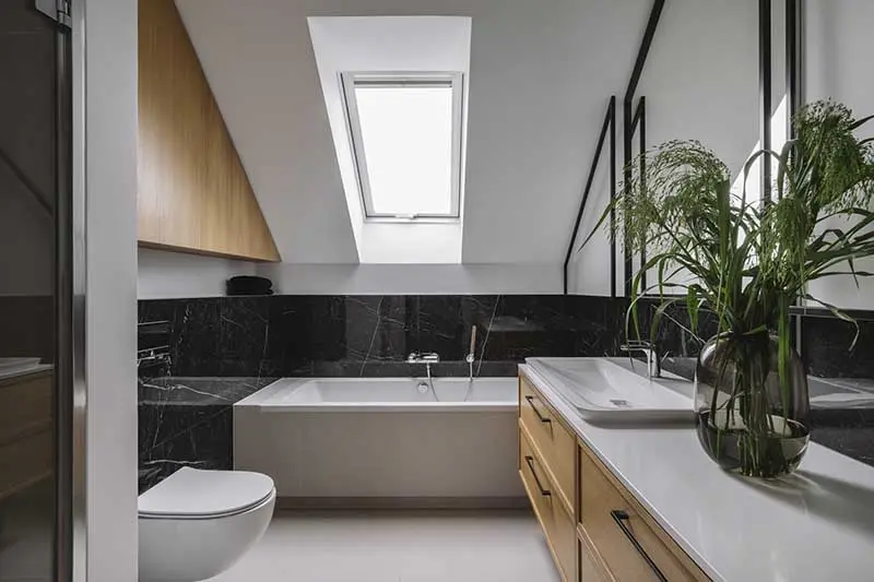 W drugiej łazience pierwsze skrzypce grają płytki ze wzorem kamienia oraz dębowe meble.