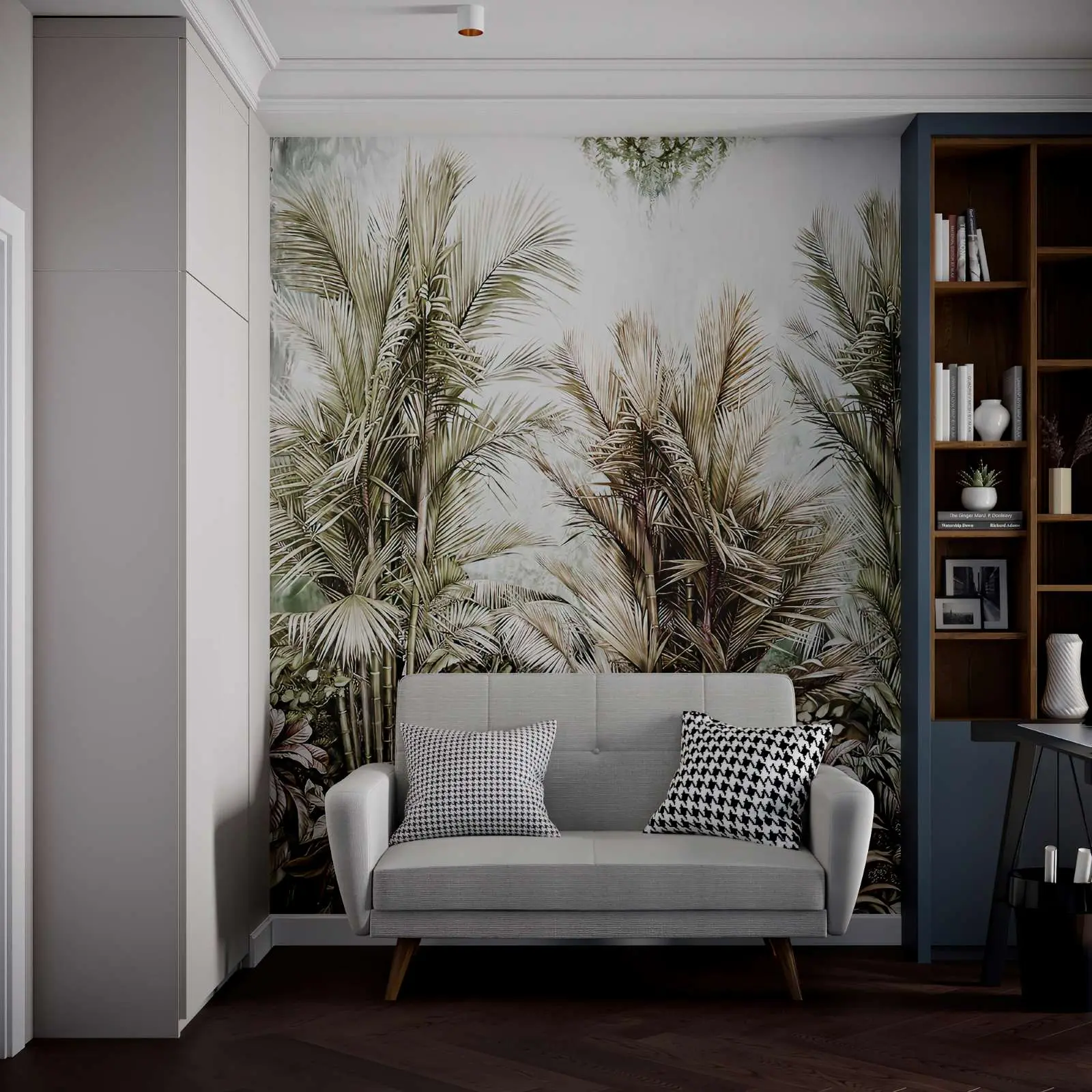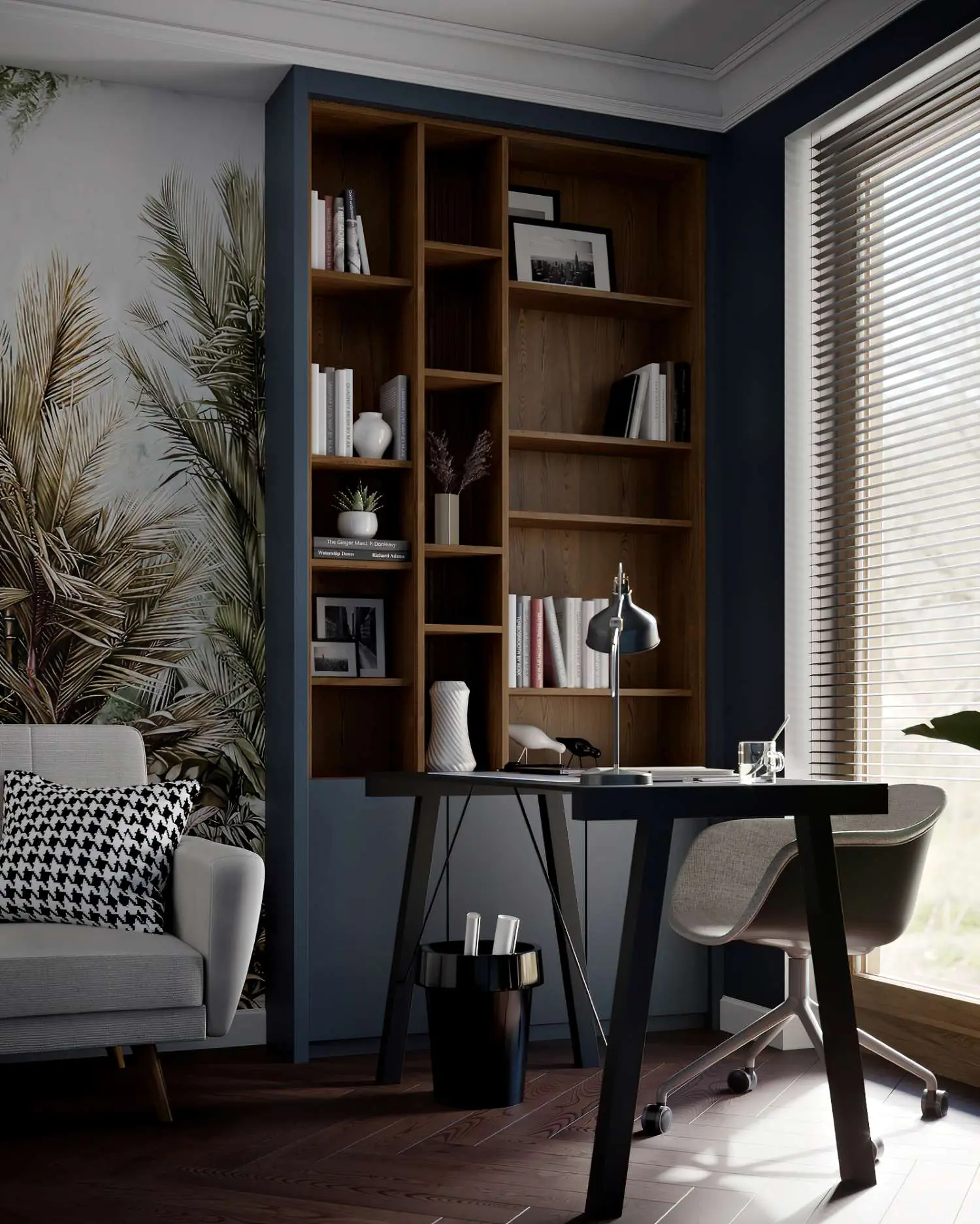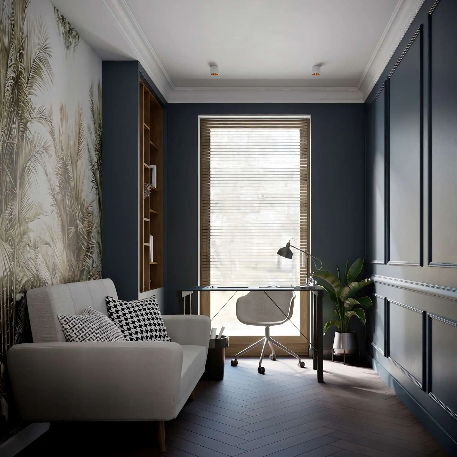 Obok klatki schodowej na parterze zaprojektowany został gabinet, który w założeniu Inwestora miał otrzymać nieco odważniejsze elementy dekoracyjne, takie jak tapeta z motywem roślinnym i ściana ze sztukaterią. Klimat tego wnętrza miał być ukłonem w stronę stylu klasycznego w nowoczesnym wydaniu.