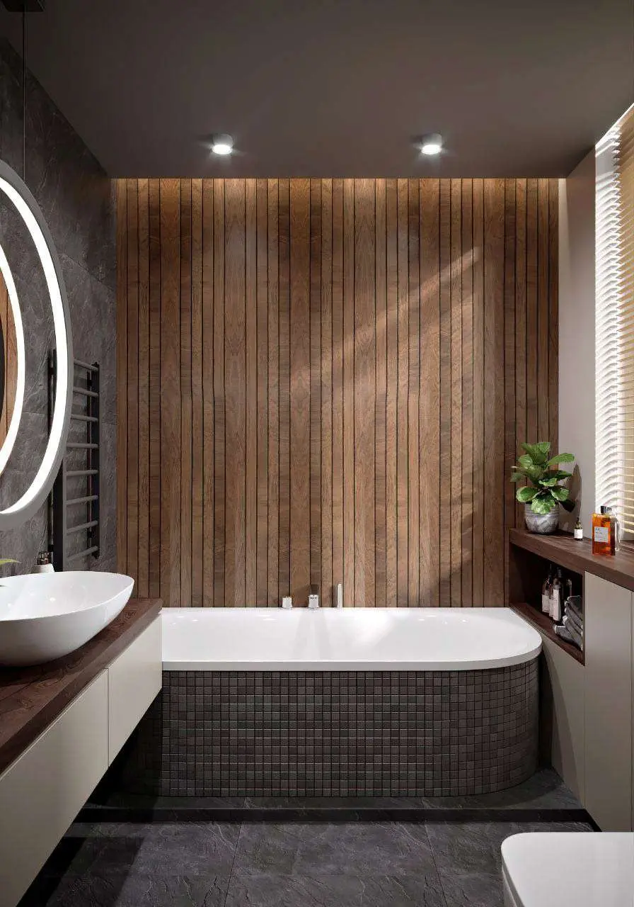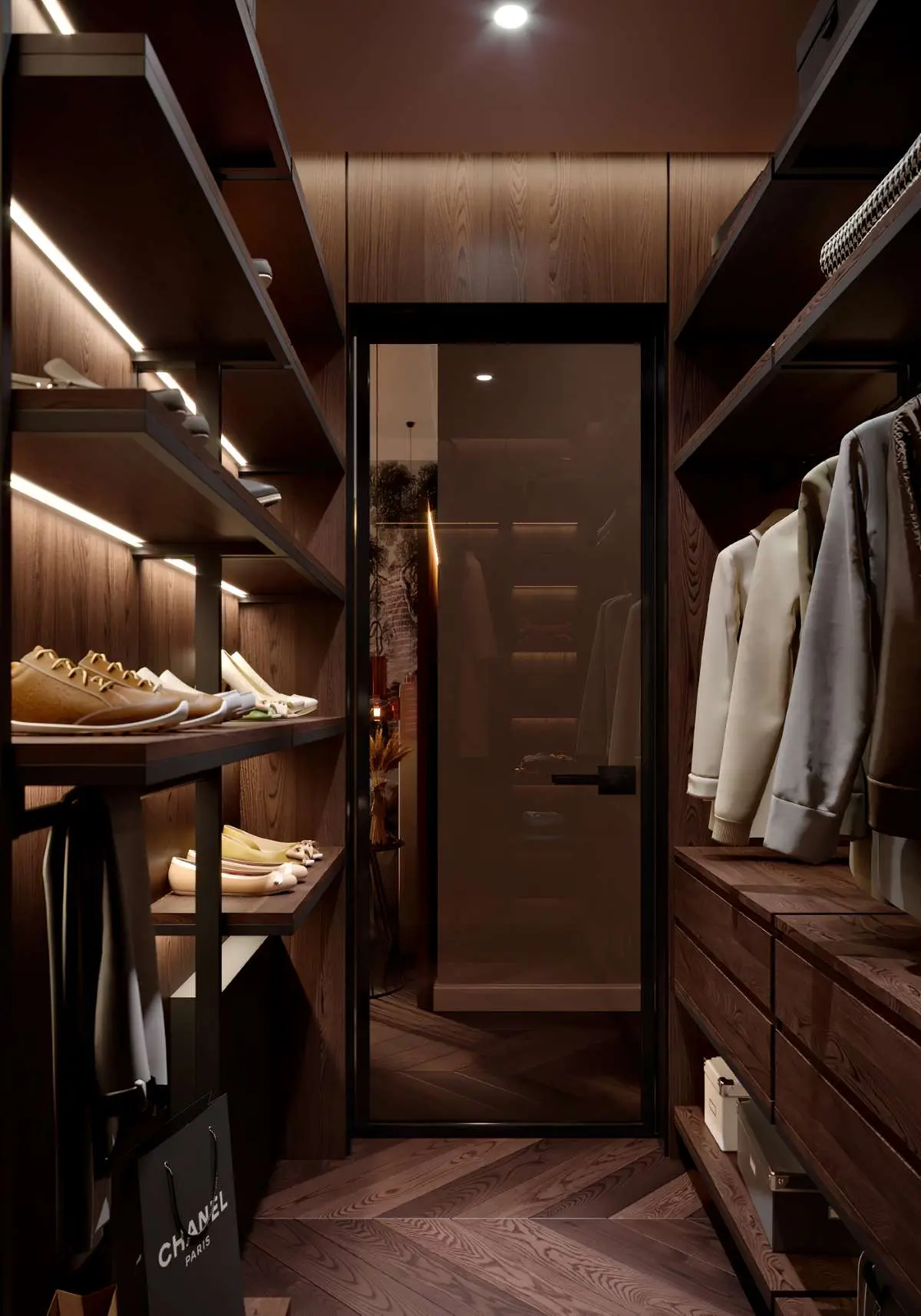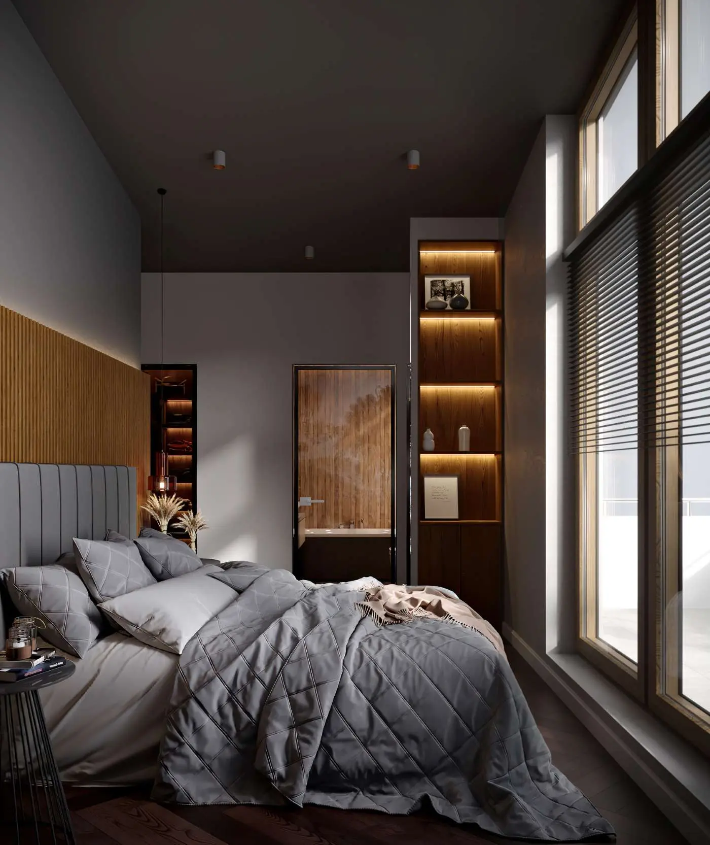 Obok sypialni zaprojektowano łazienkę en suite i garderobę. Oba pomieszczenia nawiązują do ciemnych odcieni sypialni, w formie grafitowego sufitu i ciemnych płytek w łazience. Za wanną znajduję się ściana z płytek wyglądających jak pionowe drewniane deski, co również jest odniesieniem do ściany za łóżkiem w sypialni. Drzwi do obu pomieszczeń zaprojektowane są z przyciemnionego szkła.