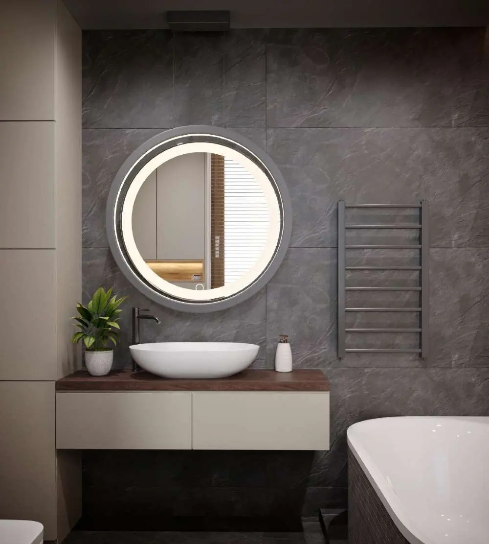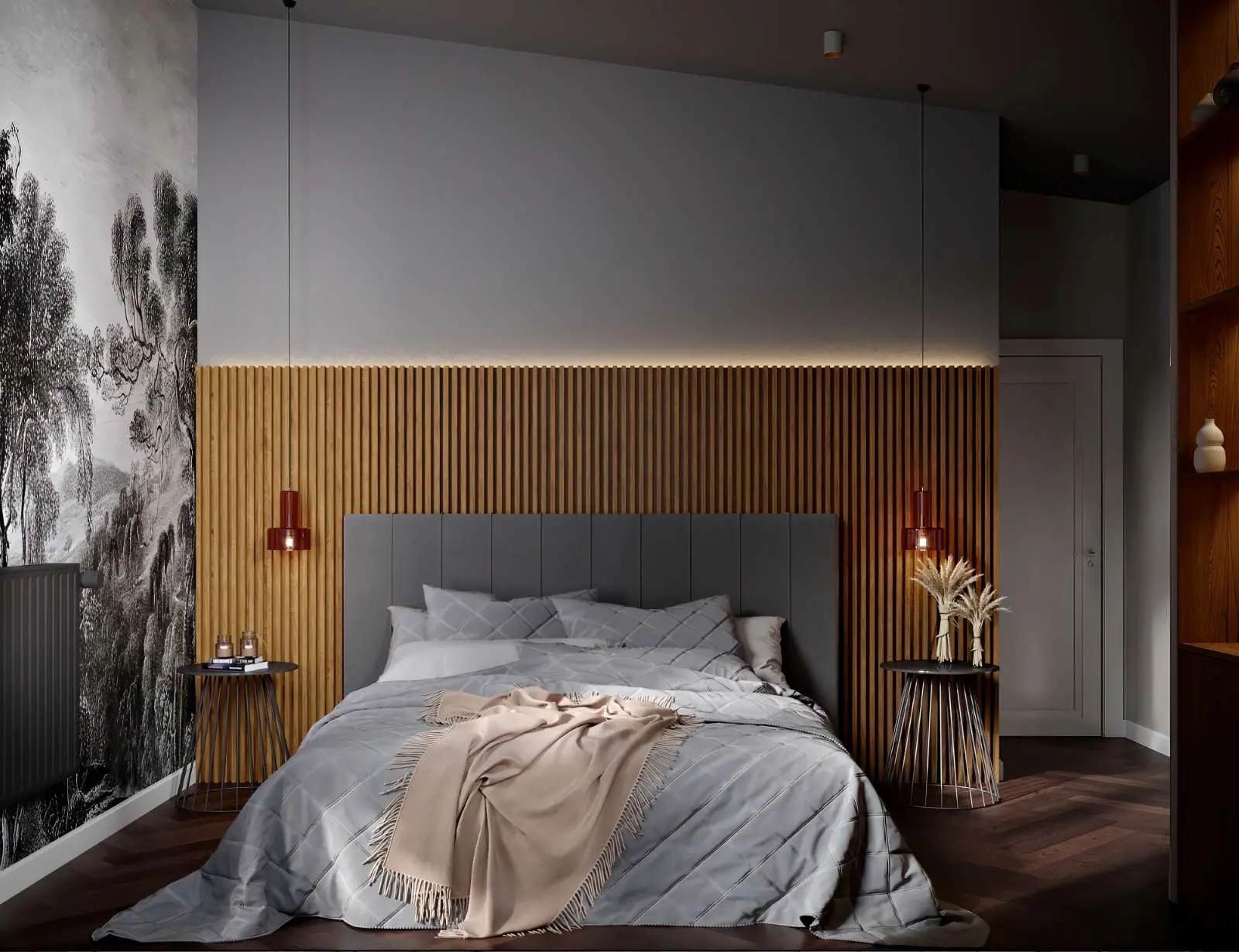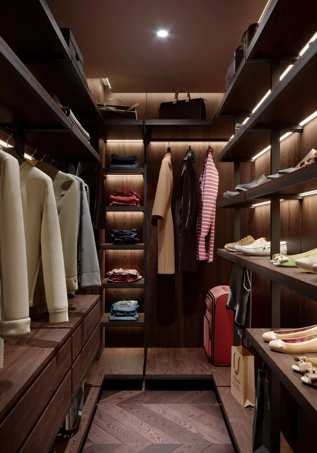 Obok sypialni zaprojektowano łazienkę en suite i garderobę. Oba pomieszczenia nawiązują do ciemnych odcieni sypialni, w formie grafitowego sufitu i ciemnych płytek w łazience. Za wanną znajduję się ściana z płytek wyglądających jak pionowe drewniane deski, co również jest odniesieniem do ściany za łóżkiem w sypialni. Drzwi do obu pomieszczeń zaprojektowane są z przyciemnionego szkła.