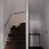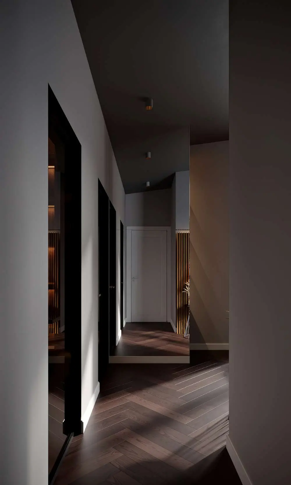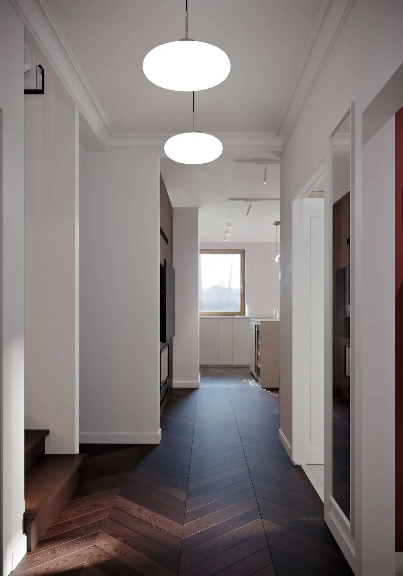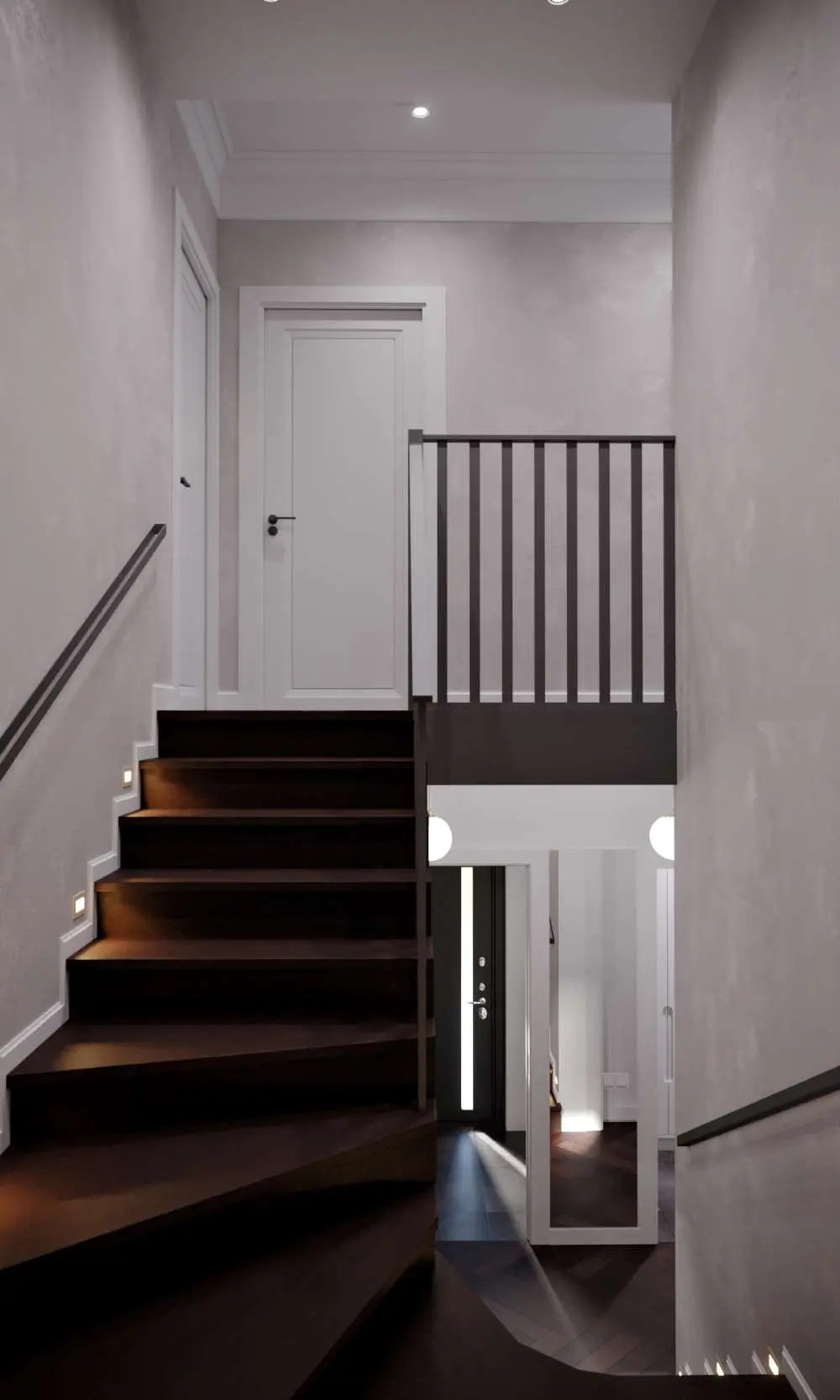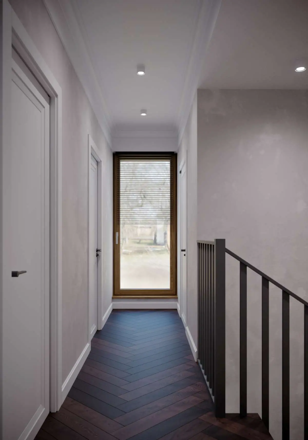 Przedsionek, korytarz, klatka schodowa, podobnie jak strefa dzienna otrzymały ciemne drewno, a jej ściany wykończone zostały tynkiem dekoracyjnym z delikatną tintą różu, sufit zaś pozostał śnieżno-biały. Klatka schodowa stanowi kontynuację ciemnej podłogi, zaś balustrady, podobnie jak wszystkie elementy ślusarskie w domu, zostały wykończone grafitowym kolorem.