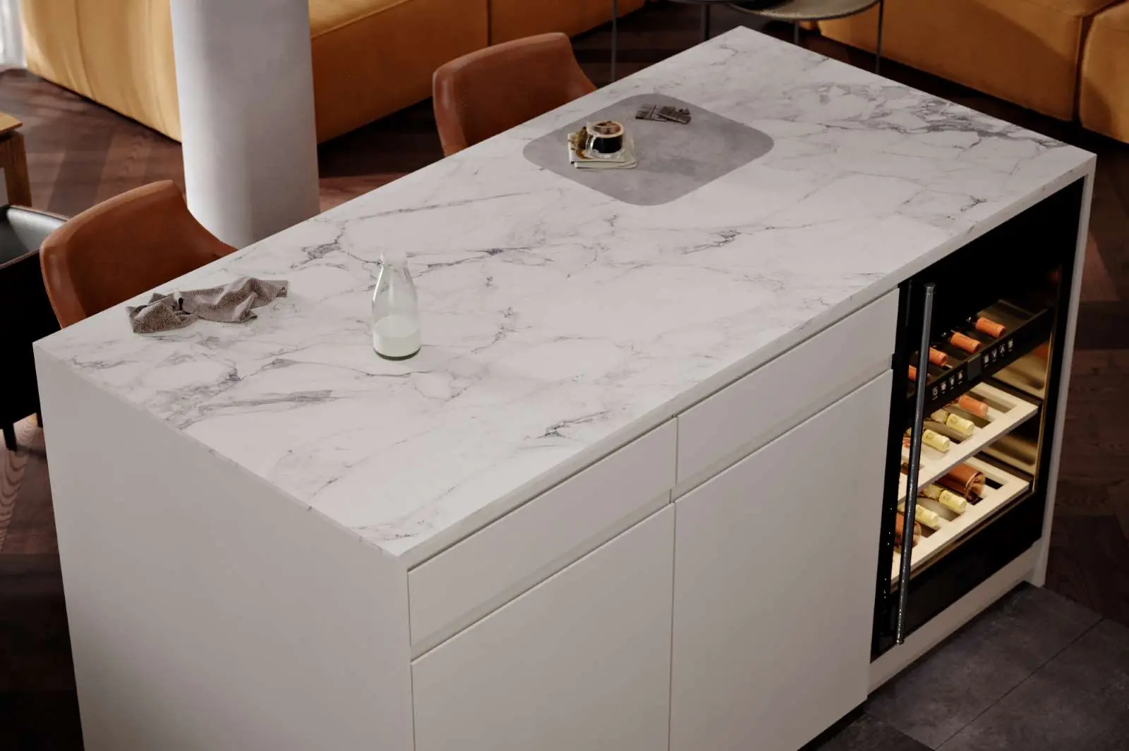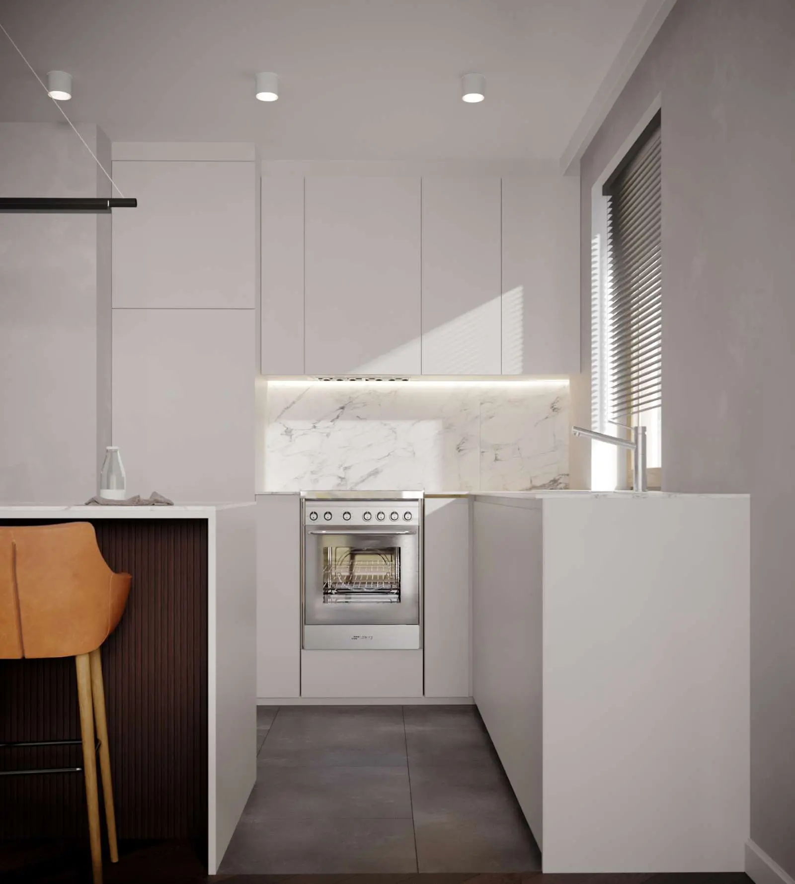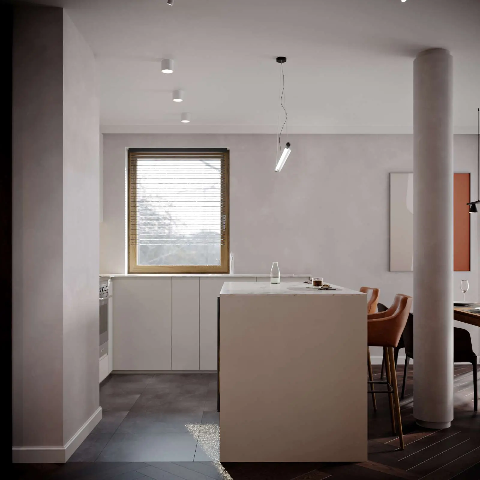 Kuchnia, w kontraście do reszty mieszkania, zaprojektowana została w jasnych odcieniach, bieli i marmuru. Z uwagi na ograniczoną powierzchnię tej strefy, do blatu roboczego kuchni włączono wyspę, o tej samej wysokości. Same blaty są dość wysokie, podyktowane wzrostem inwestorów. W wyspie wydzielono jeden korpus na przeszkloną lodówkę na wina, zaś dużą lodówkę ukryto za białymi frontami.