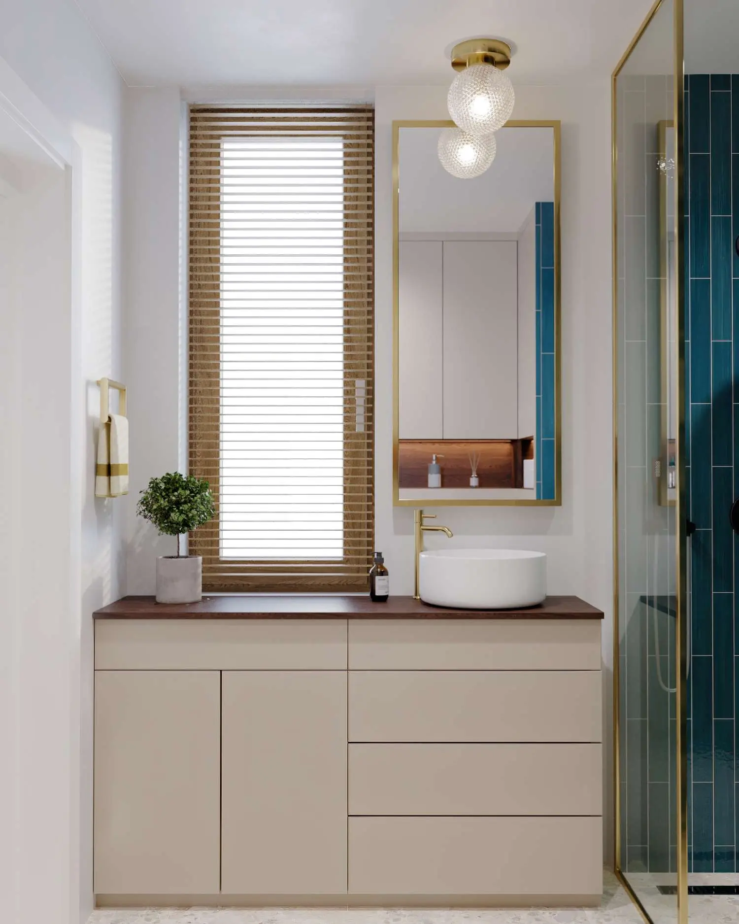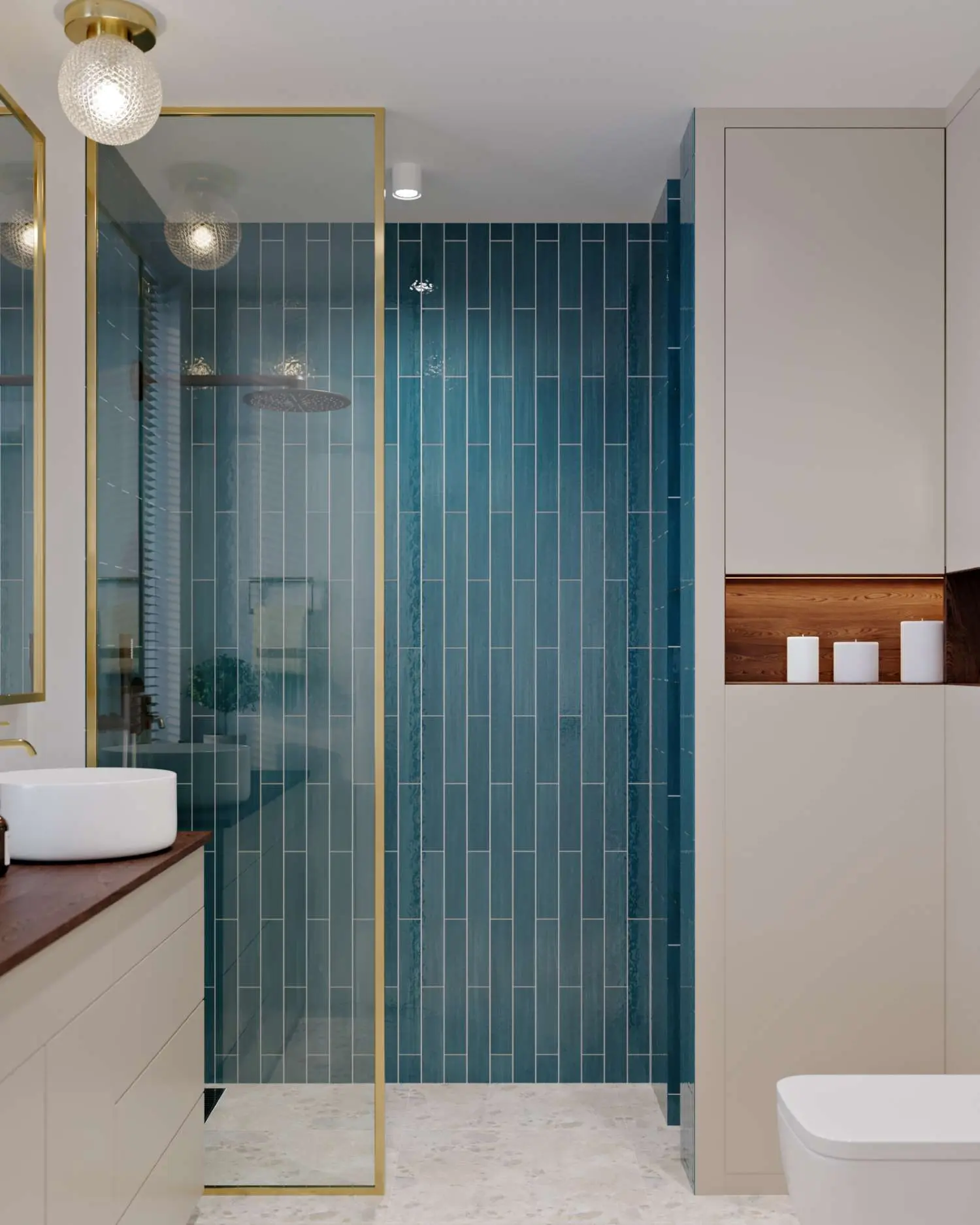 Łazienka dla gości miała być bardziej dekoracyjna. We wnęce prysznicowej zaprojektowano turkusowe płytki w formie cegiełek w orientacji pionowej, co optycznie podwyższa pomieszczenie. Elementy ślusarskie i wylewki zaproponowano w złotym wykończeniu. Tłem dla tych elementów są jasne płytki podłogowe, biały sufit oraz meble stolarskie, które wykończone zostały w takim samym kremowym kolorze co w łazience en suite.