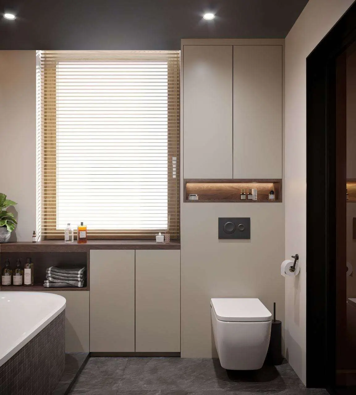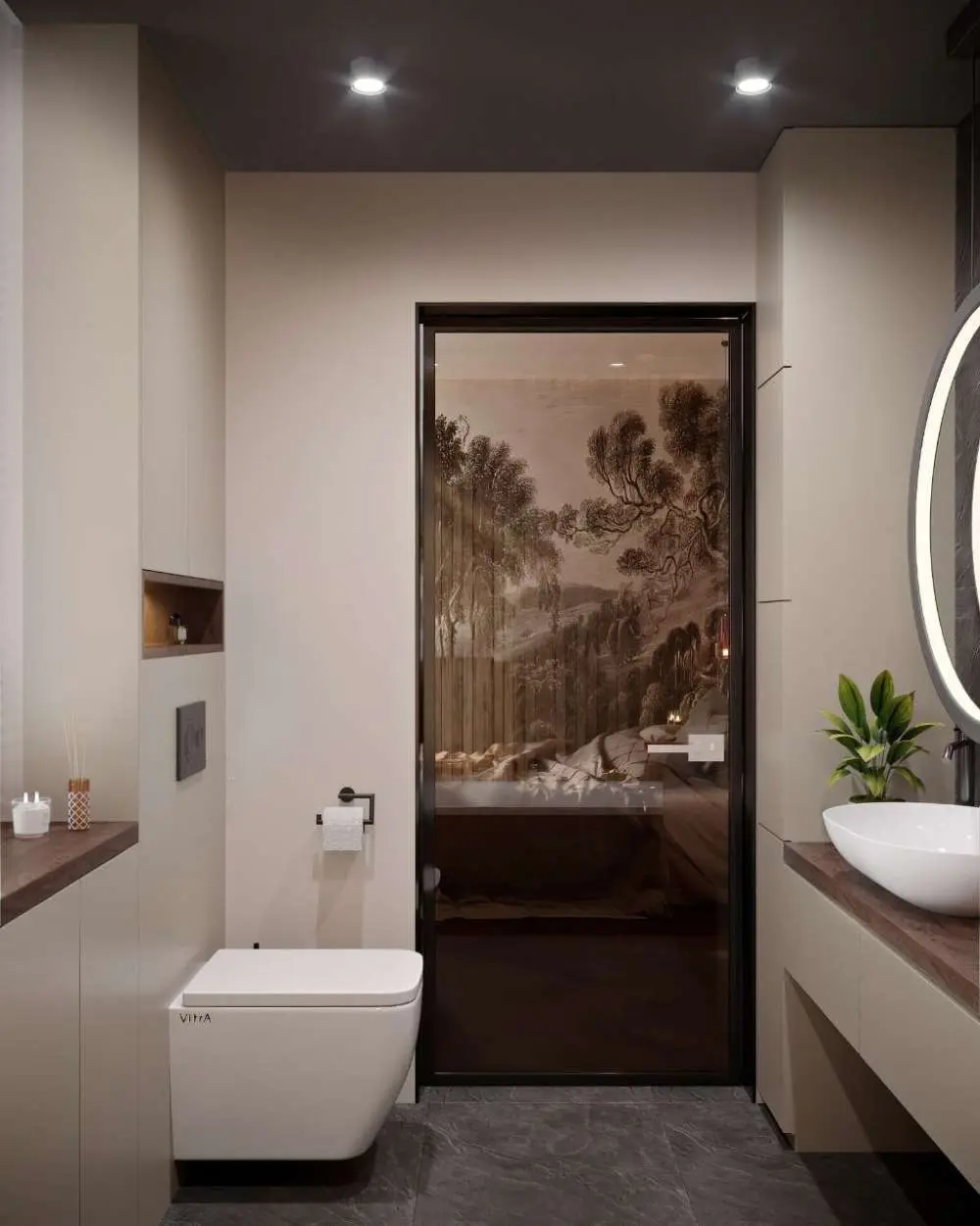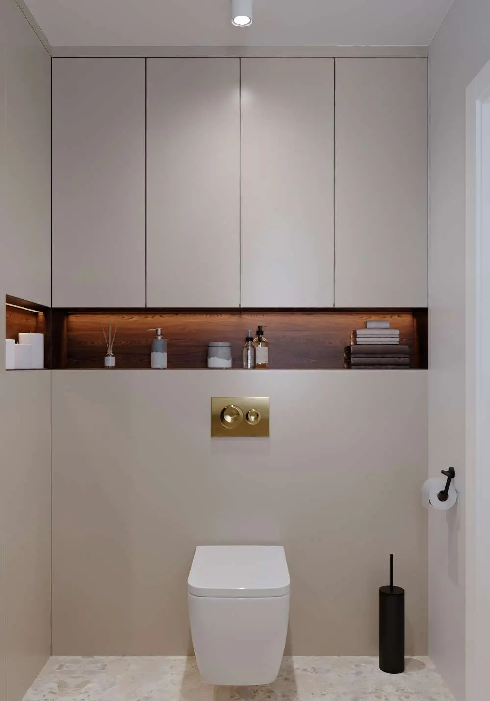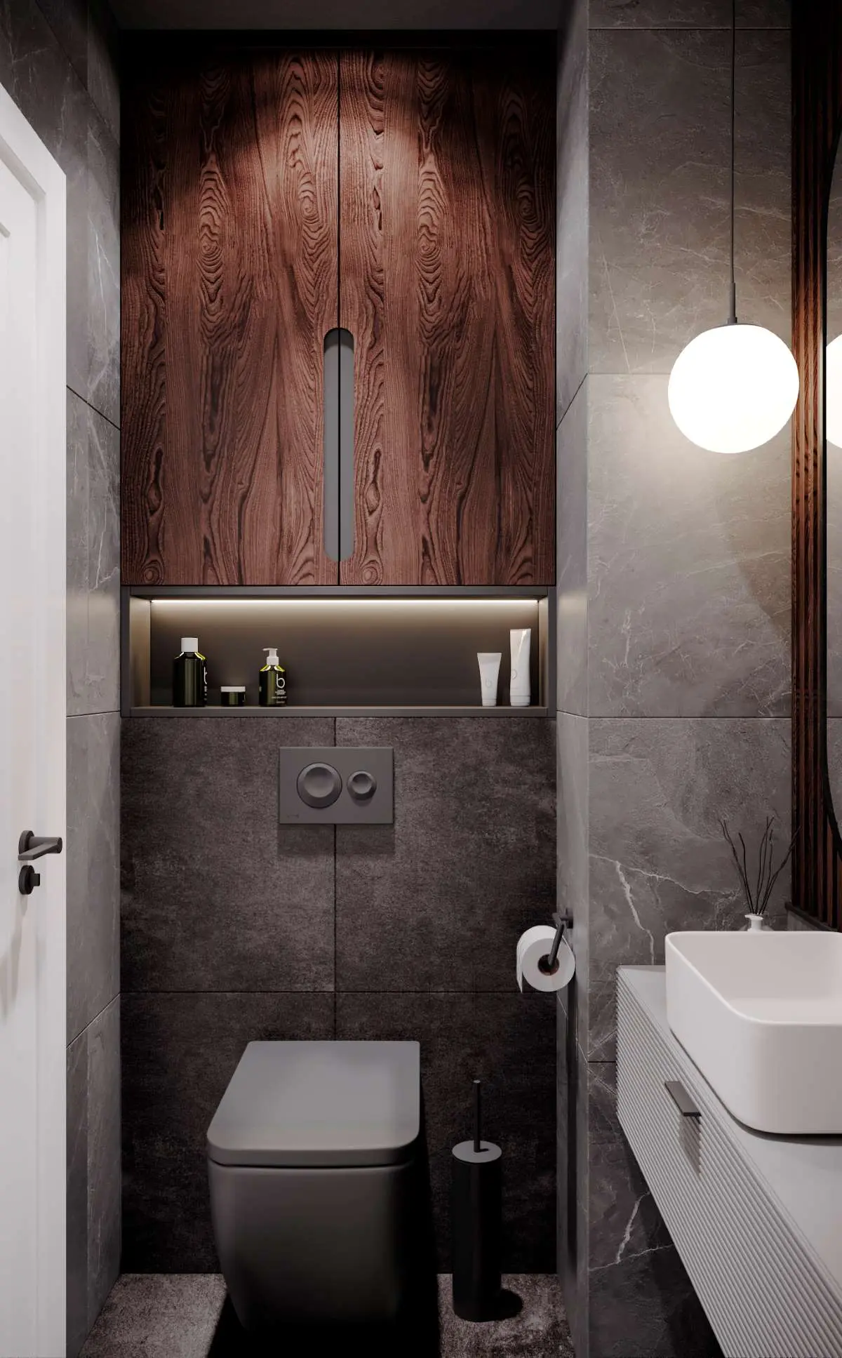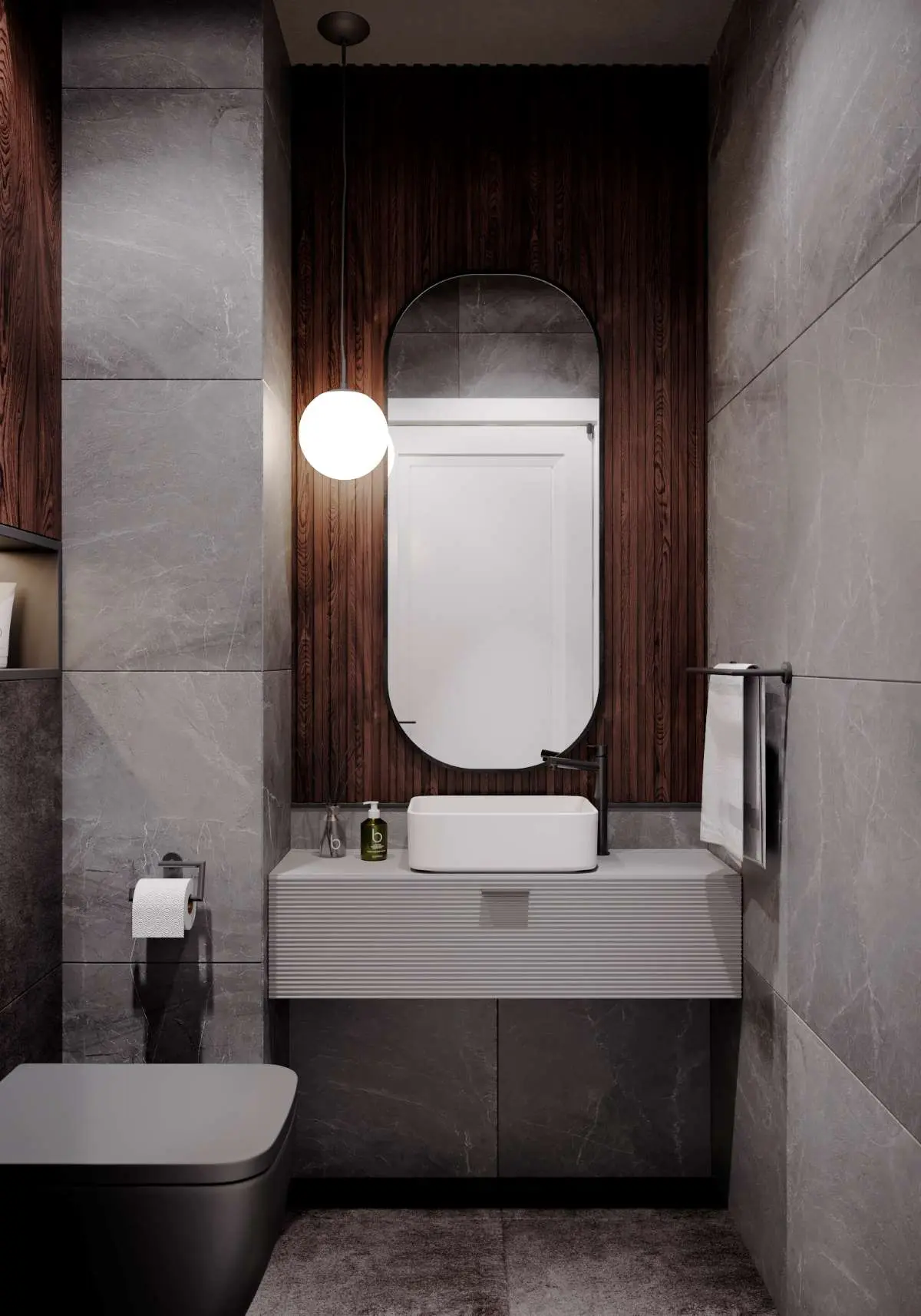 Toaleta na dole została zaprojektowana w konwencji szarych kolorów z połączeniem ciemnego orzechowego drewna, analogicznego do podłóg i mebli w innych pomieszczeniach.