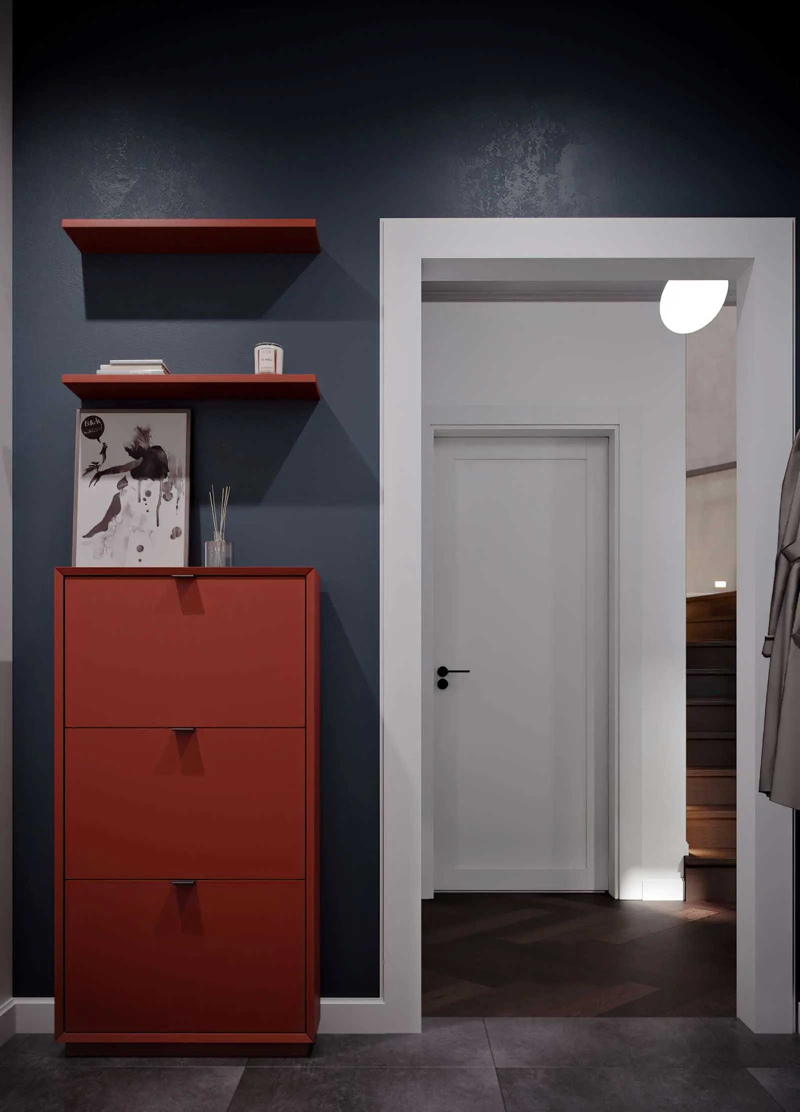 Od samego wejścia do domu można poczuć, że nie zabraknie w nim odważnych rozwiązań i wyrazistych kolorów. W projekcie przeplata się ciemny brąz połączony z karmelem, granatem, bordo i turkusem.