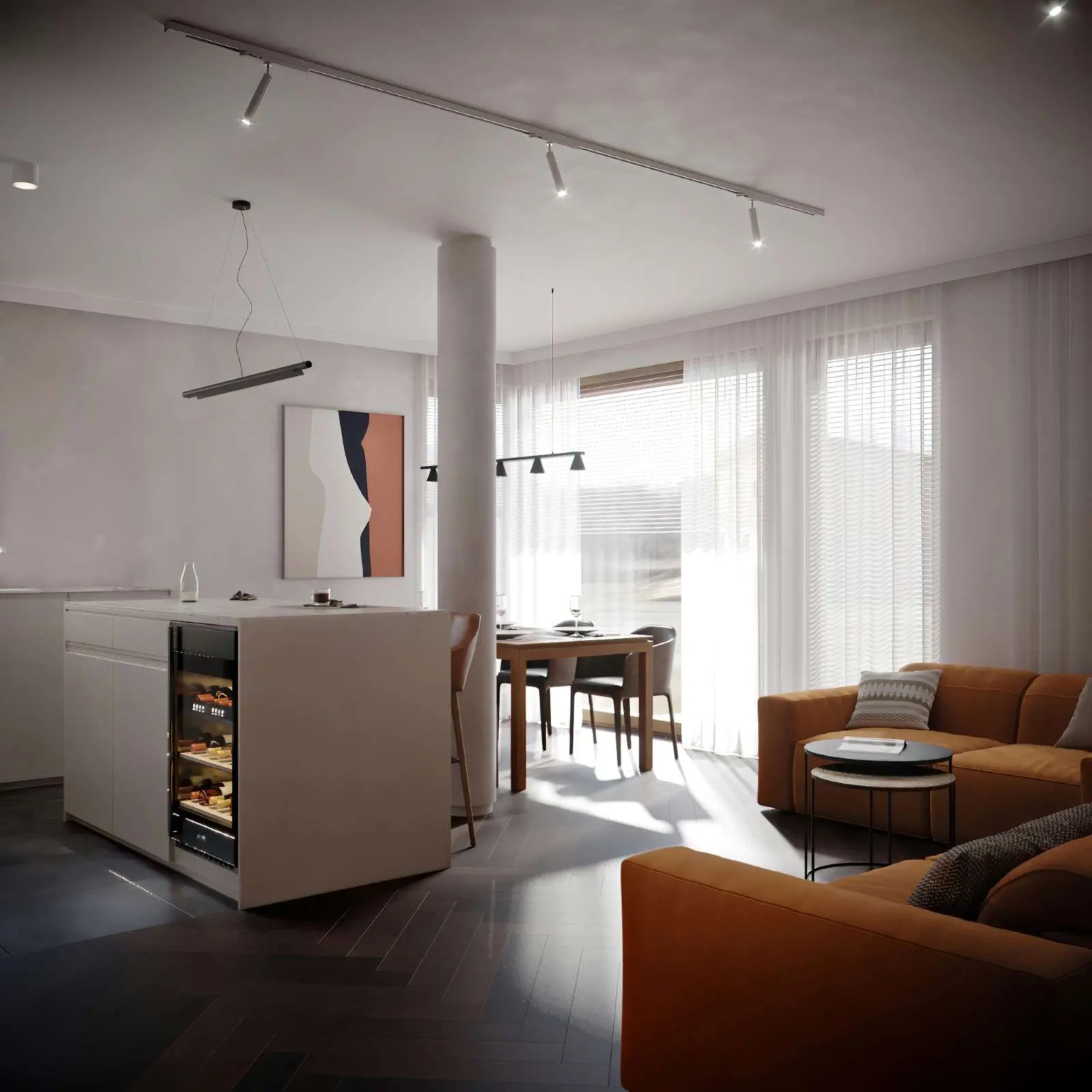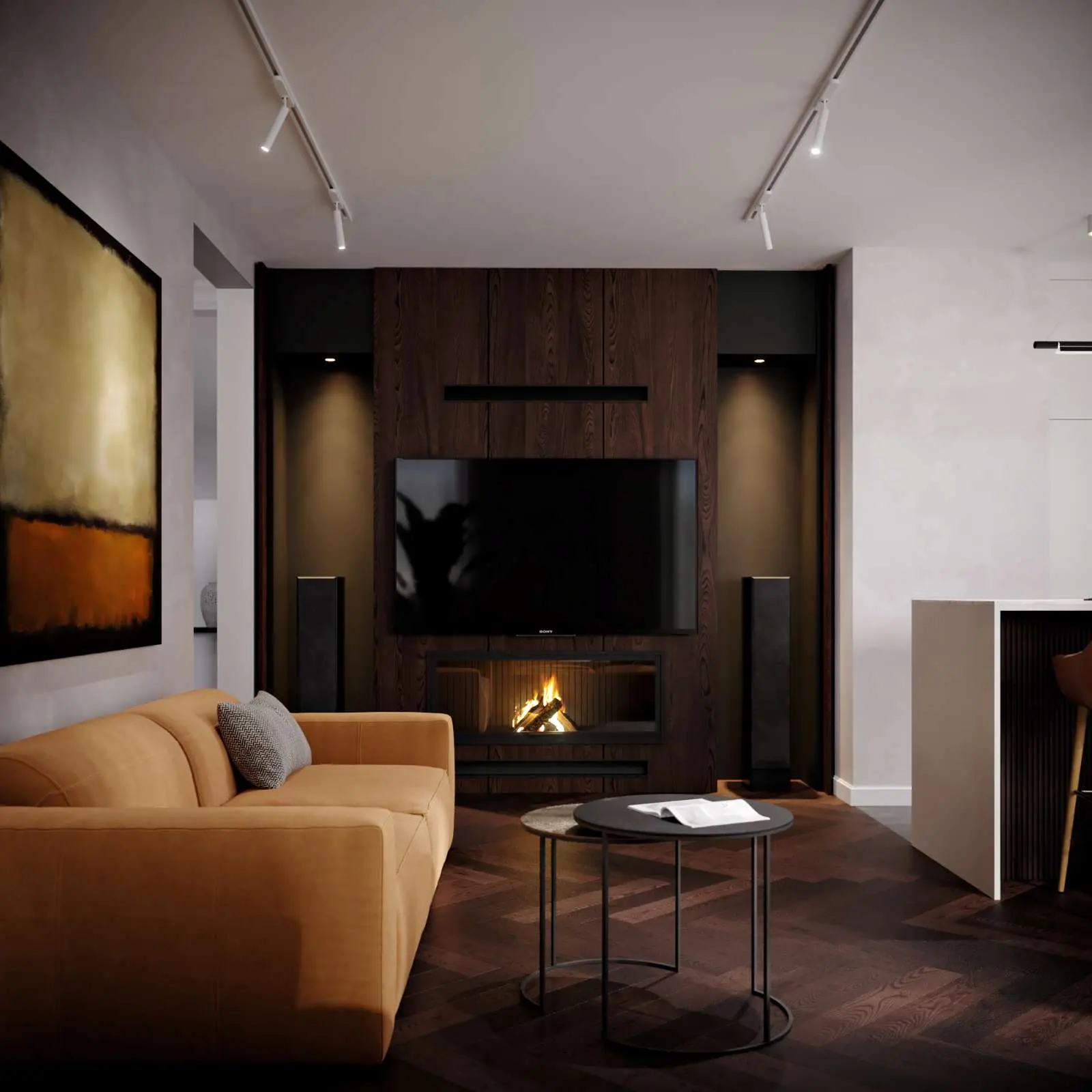 Strefa salonu otrzymała dwie miękkie sofy w kolorze karmelowym, które ożywiają wnętrze. Obok nich zaprojektowano dekoracyjną ścianę z ciemnego drewna z kominkiem, telewizorem i dwoma wnękami na kolumny audio, które mają drzwi w systemie otwierano chowanym, to oznacza, że po ich uchyleniu można je wsunąć we wnękę.