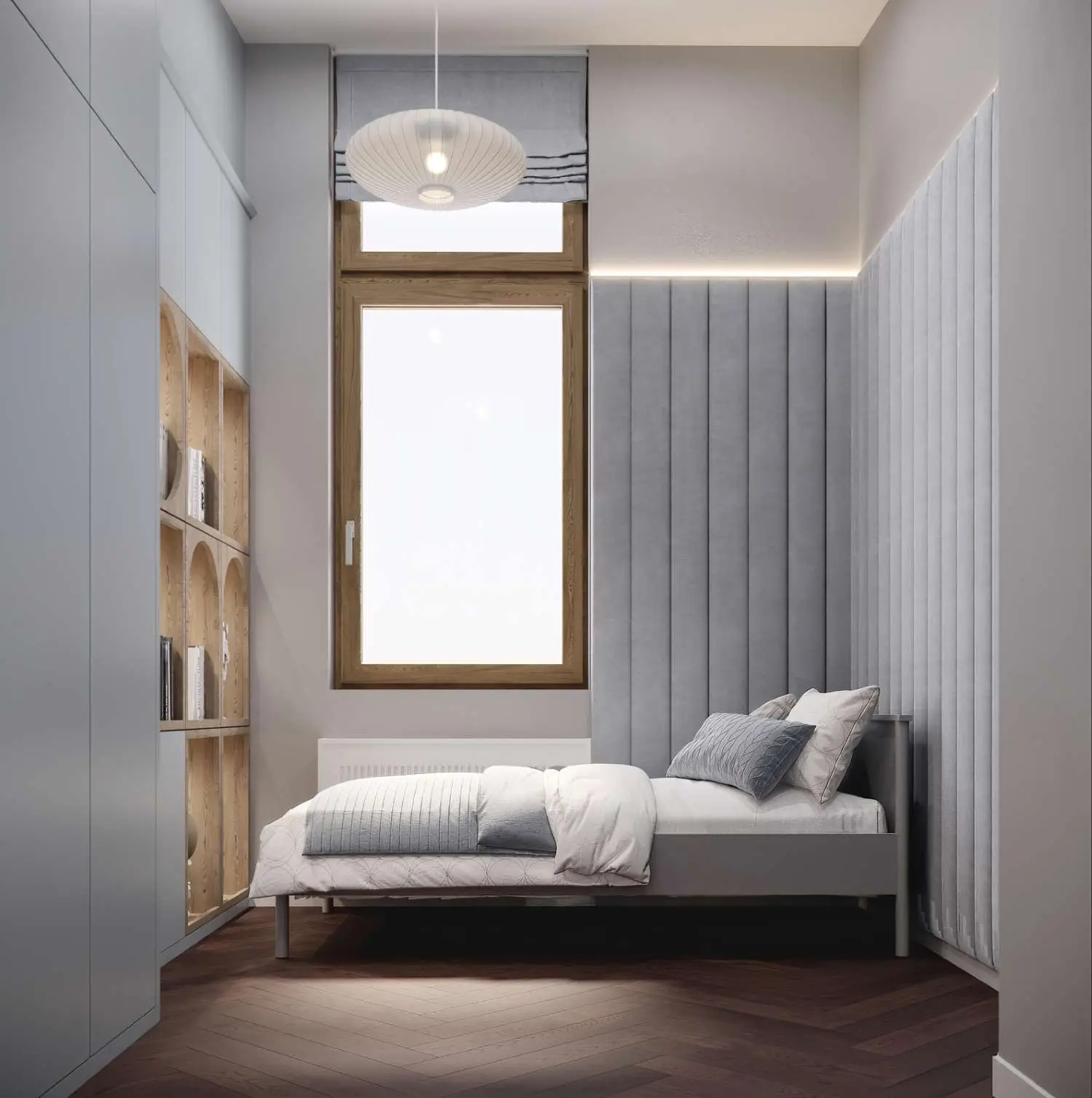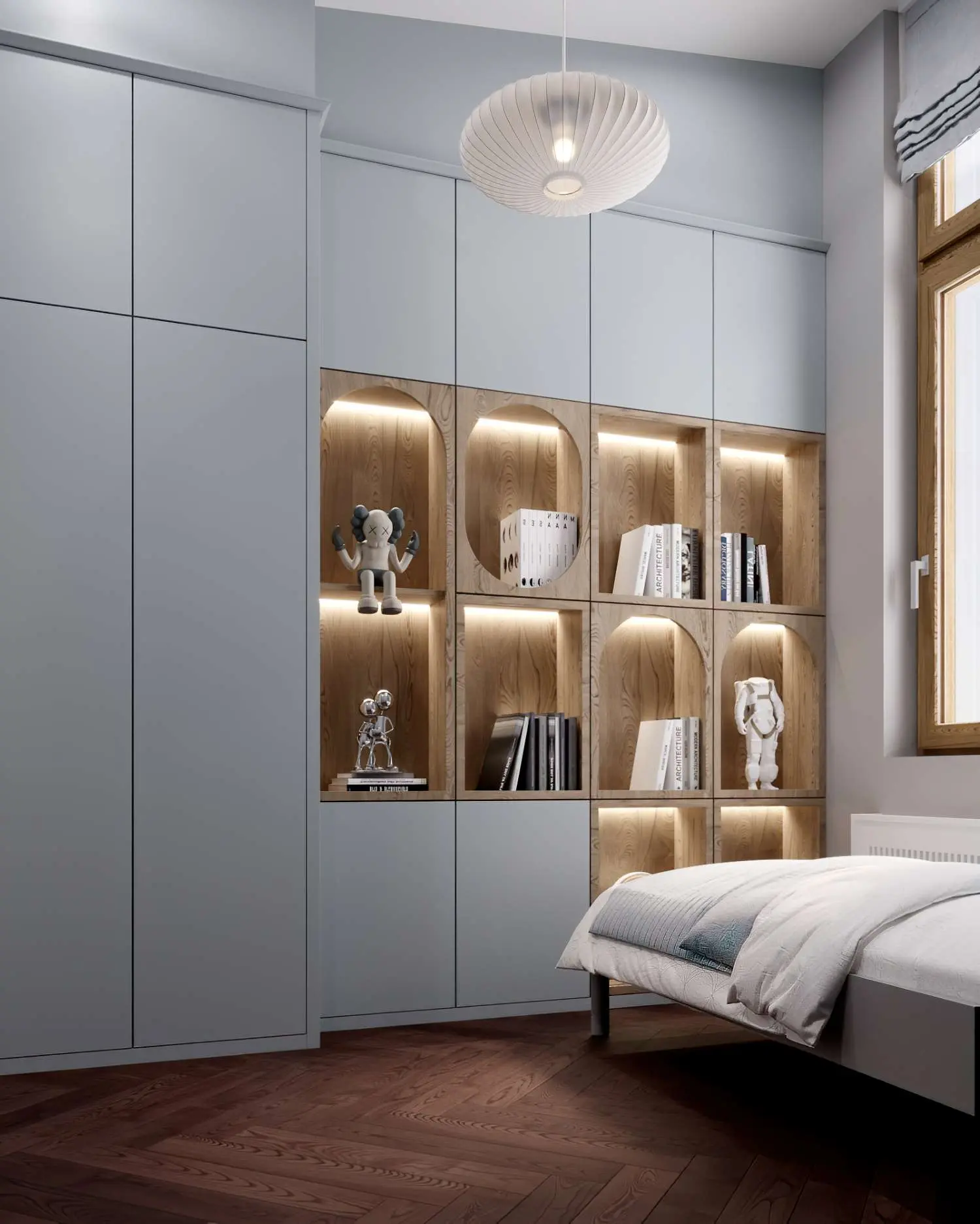 Pokój dziecka zaprojektowany został w klimacie pozostałych wnętrz, ale przy użyciu koloru jasnego błękitu. Ściana za łóżkiem wyłożona została miękkim tapicerowaniem na wysokość ponad dwóch metrów. Po przeciwnej stronie zaprojektowano zabudowę meblową z częściowo otwartymi półkami w formie dekoracyjnych, geometrycznych kształtów.