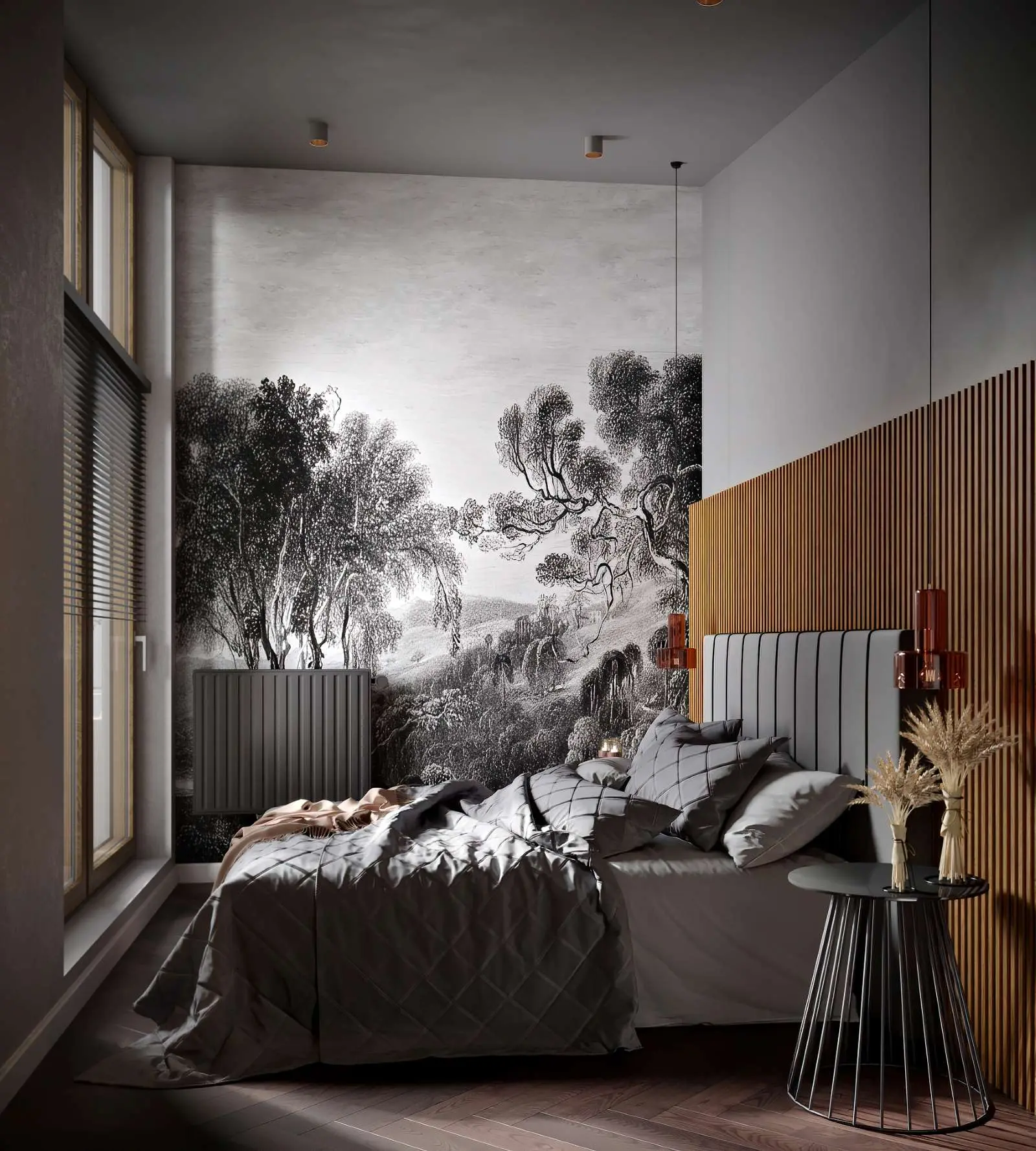 Sypialnia na piętrze stanowi w pewnym sensie „osobny świat”. Zaproponowano w niej ściany i sufit jako nieco przyciemnione, tak aby stworzyć atmosferę odprężenia i wyciszenia, co nawiązuje do klimatu „jaskini” i pewnych pierwotnych instynktów, powrotu człowieka do jego bezpiecznego schronienia. Jedna ze ścian sypialni ma właśnie taki widok, jakby z wnętrza jaskini na dziki, tajemniczy krajobraz. Ściana vis a vis kontynentalnego łóżka ma wielkie przeszklenie, którego skala pozwoliła architektom zastosować ciemne kolory we wnętrzu. Szare tło za łóżkiem przełamane zostało zabudową w formie naturalnych drewnianych lameli.