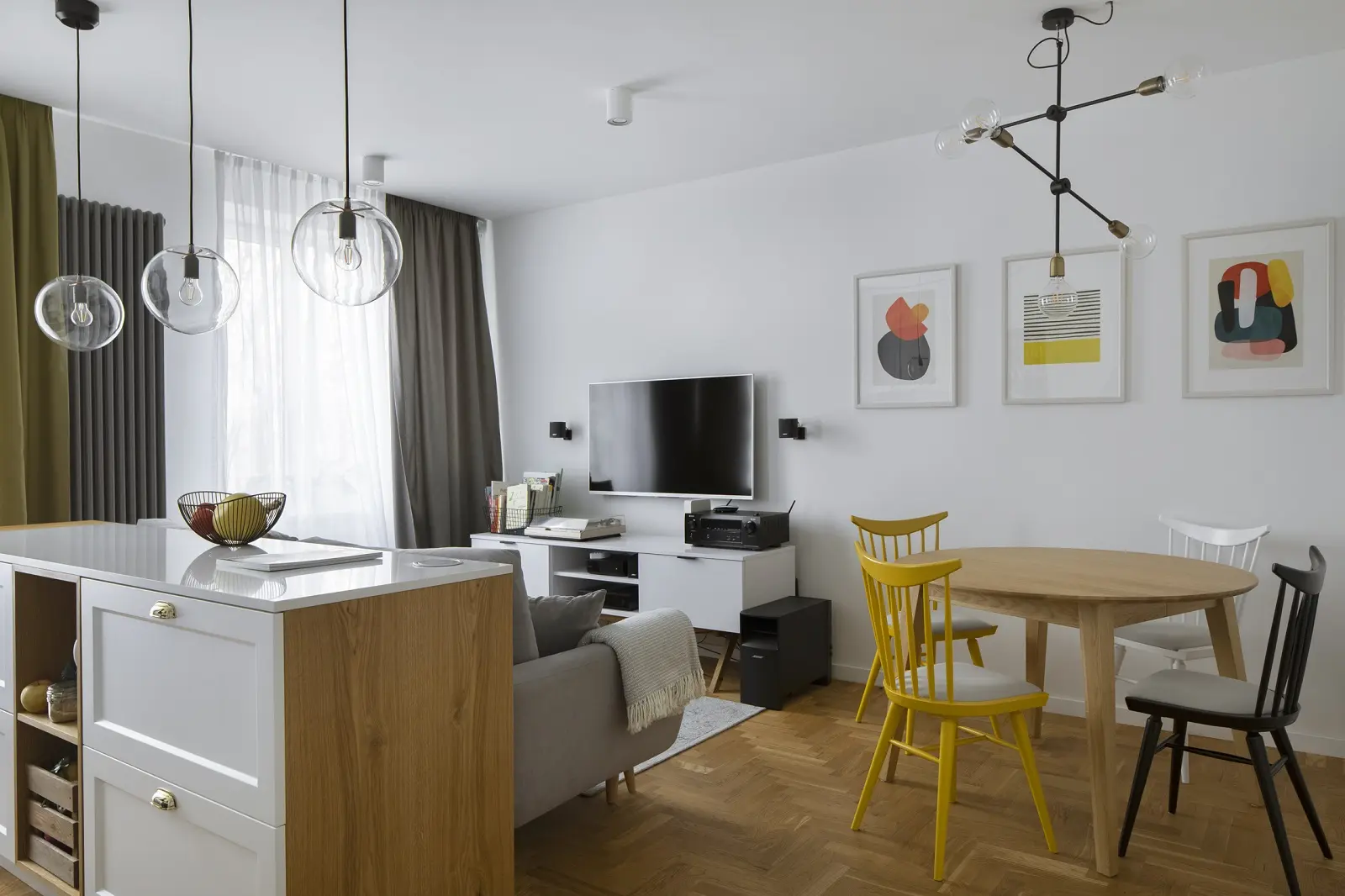 Młodzi gospodarze nie lubią mebli z popularnych sieciówek. Chcieli, by przestrzeń miała własny, oryginalny charakter. Uważne oko dostrzeże w wystroju nawiązania do lat 70., np. krzesła zwane patyczakami – starannie odnowione i pomalowane. Dwa z nich są żółte i nie jest to przypadek. Kolor ten pojawia się także na grafikach w kąciku jadalnym oraz w łazience – w tej barwie jest tam specjalnie zaprojektowany dekoracyjny grzejnik. Ponieważ gospodarze zaznaczyli, że nie lubią nadmiaru barw, we wnętrzu, prócz bieli ścian i żółci, obecny jest tu ciemny grafit oraz brąz naturalnego drewna.