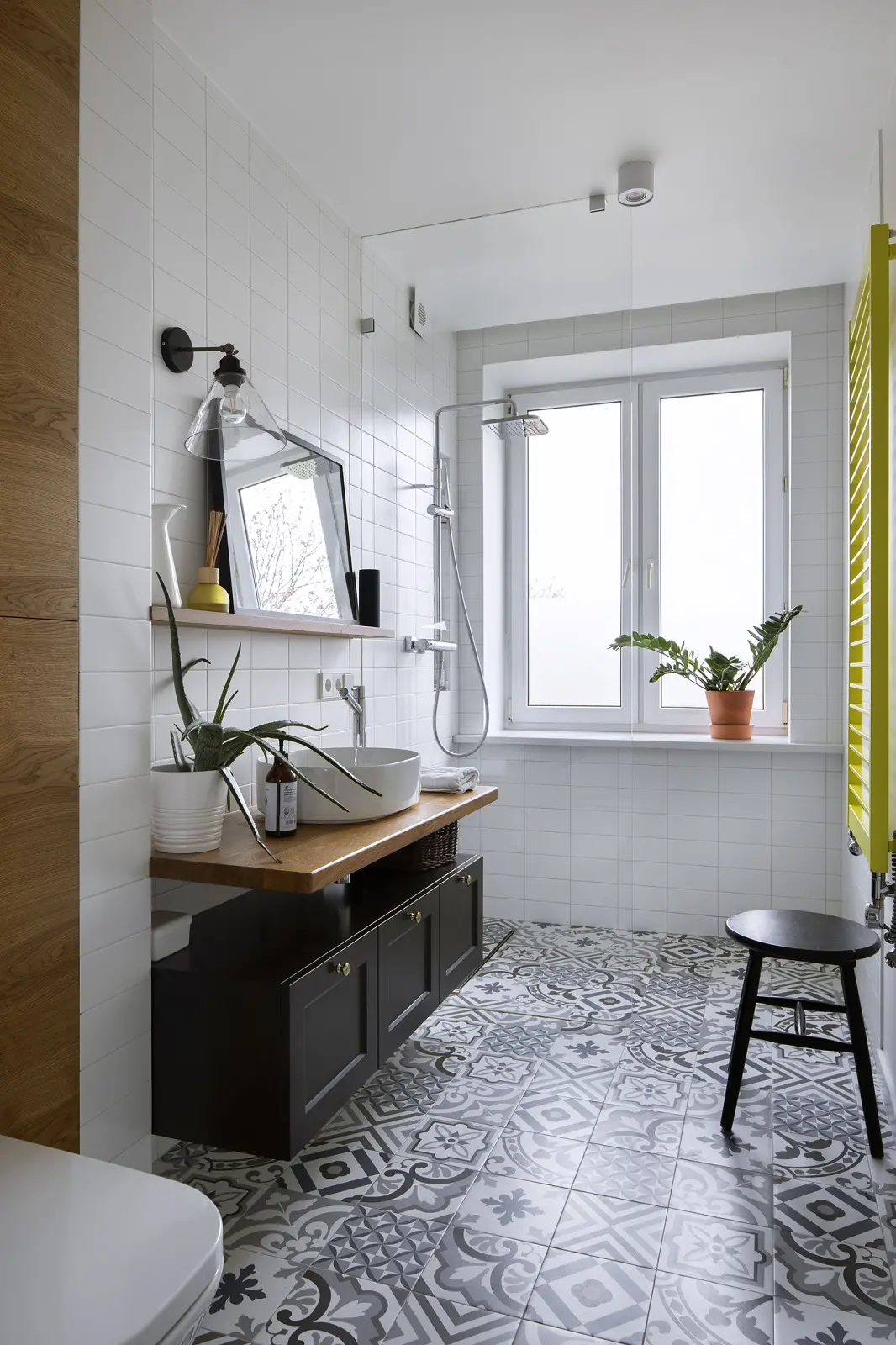 Parkiet ułożony w tradycyjną jodełkę jest odwołaniem do minionych lat. Drewno w tym samym odcieniu co podłoga pojawia się także w wykończeniu pozostałych pomieszczeń. W oszczędnym kolorystycznie wnętrzu podłoga w części kuchni, w łazience i przedpokoju wyłożona płytkami zyskała wielką moc dekoracyjną. Wzorzysta posadzka może kojarzyć się z PCV sprzed lat, jednak to dość odległe nawiązanie – jej nowoczesne wzornictwo i elegancki odcień nie pozostawiają wątpliwości, że takie skojarzenie to tylko zamierzony trik stylistyczny.