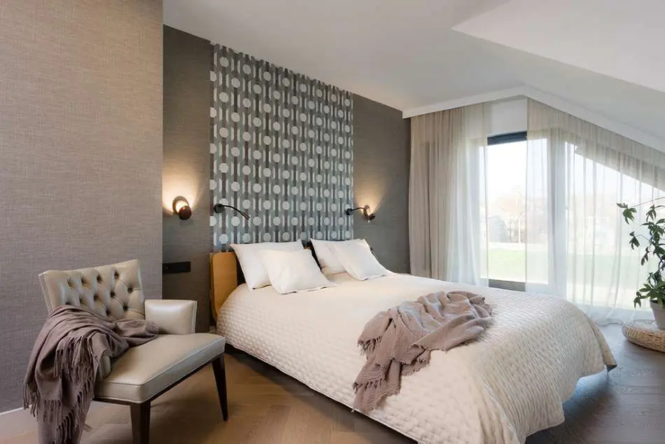Sypialnia Inwestorów znajduje się na piętrze i została połączona z łazienką oraz garderobą. Aranżacja w odcieniach szarości uspakaja i koi zmysły. Kolor ten, często niedoceniany jest tu podstawą aranżacji. Co więcej zestawiony z ciekawym elementem dekoracyjnym, jakim jest wzorzysta tapeta na ścianie za łóżkiem tworzy zaskakujący efekt.