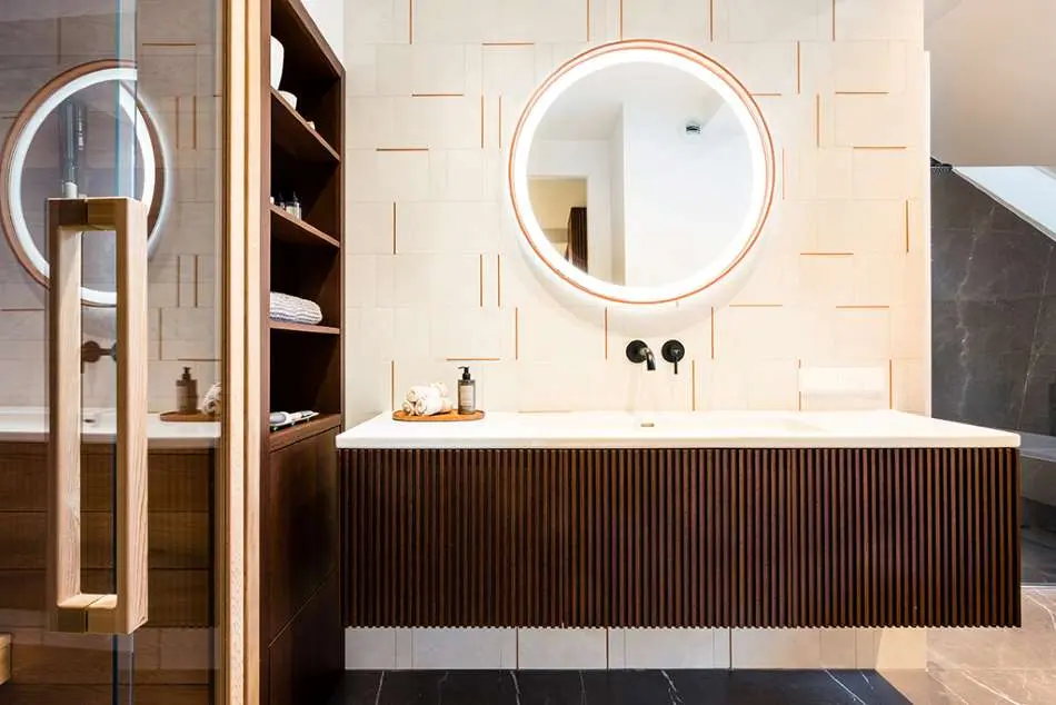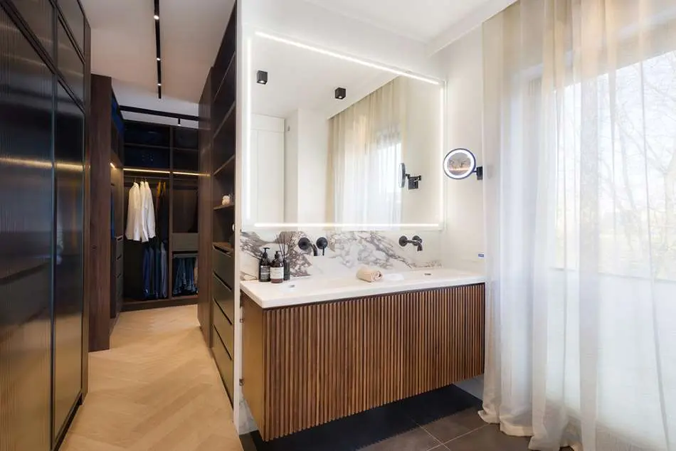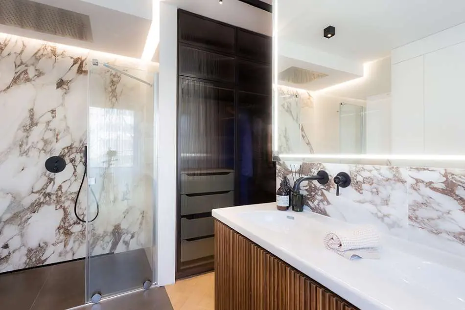 Łazienka urządzona została z wykorzystaniem pięknego marmuru w strefie umywalkowej oraz prysznicowej. Czarna armatura nadaje indywidualnego charakteru a dwie umywalki stanowią funkcjonalne wyposażenie wnętrza. Piękna podwieszana szafka podumywalkowa z drewnianymi lamelami uzupełnia idealny obraz kąpielowej przestrzeni.