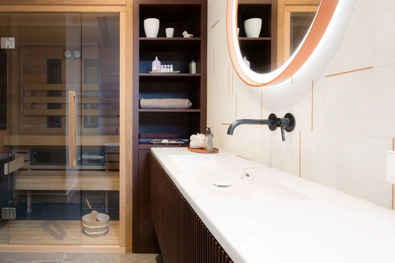 Druga łazienka posiada w swym wyposażeniu saunę. Regularne korzystanie sauny wzmacnia organizm, dodaje mu siły i witalności oraz poprawia krążenie krwi. Nic dziwnego, że to forma relaksu tak popularna w Finlandii, gdzie pogoda nie rozpieszcza mieszkańców.
