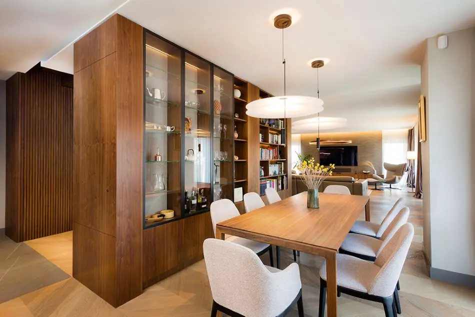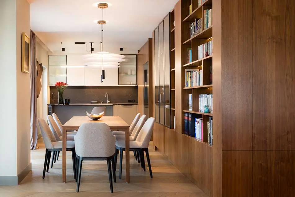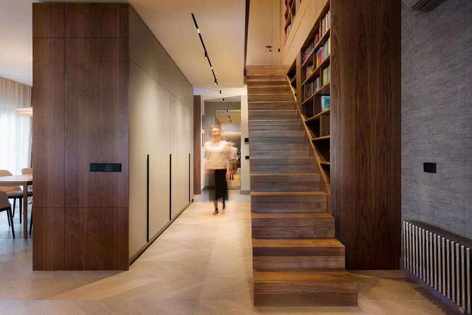Architektki zadałby o bardzo ważny aspekt, jakim są miejsca do przechowywania. Przy schodach powstała imponująca biblioteczka wysoka na 5 metrów. Zabudowa posiada również ukryty wysuwany podest, który ułatwia korzystanie z regału i sięgnięcie po książkę z wyższej półki. Po przeciwnej stronie biblioteczki znajdują się bardzo duże pojemne szafy, które od strony jadalni pełnią funkcję regałów. Pomimo, iż korytarz jest długi oraz zabudowany nie jest wcale ciemny, a to dzięki oświetleniu technicznemu, pięknej drewnianej podłodze, a także użyciu jaśniejszych, gładkich frontów szafy.