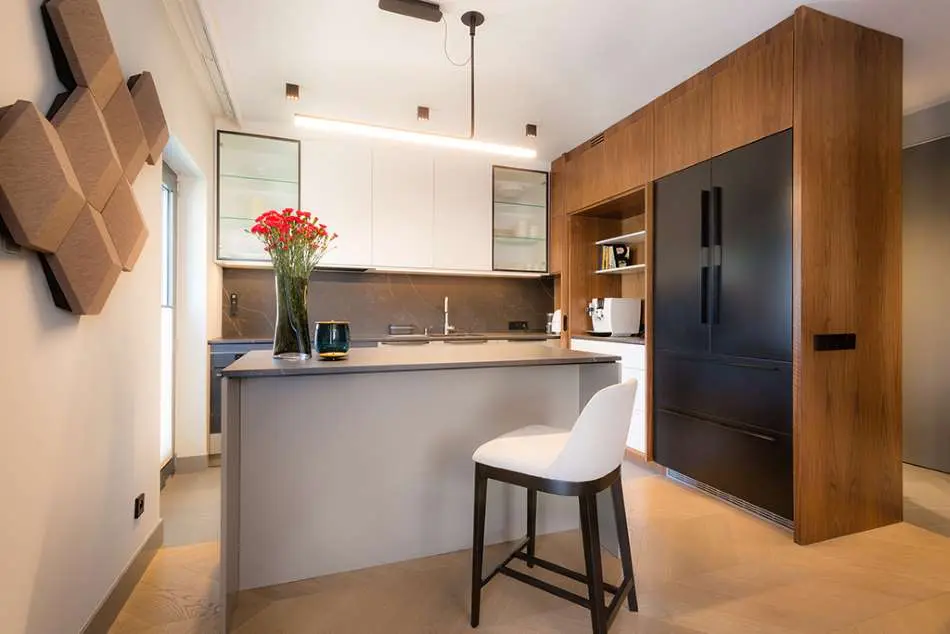 W tej przestrzeni główne skrzypce odgrywa funkcjonalna zabudowa kuchenna, która została oddzielona od strefy jadalnianej niewielką wyspą. Ciekawe zestawienie kolorystyczne nadaje świeżości i lekkości. Klasę wnętrza podkreśla drewno z jakiego wykonano meble, jest to orzech amerykański o szlachetnym kolorze. Drewno orzechowe jest jednym z najbardziej cenionych jego gatunków z uwagi na swoje wyjątkowe walory estetyczne i szerokie zastosowanie. Natomiast białe wiszące szafki nad blatem są lekkie i praktycznie niewidoczne.