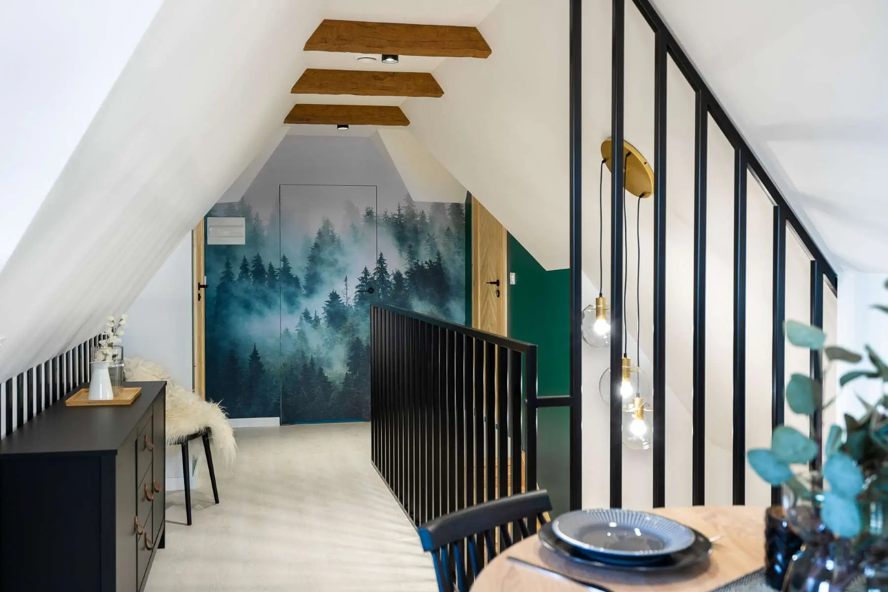 W niektórych pomieszczeniach wysokość sufitów to tylko 2,3 metra, lecz dzięki przemyślanej aranżacji nie odczuwamy różnic. Aby odwrócić uwagę od takiej ilości skosów zdecydowano się, że dominującym tematem będzie biały kolor, do tego wybrano białe drewniane podłogi, co pozwoliło wizualnie powiększyć przestrzeń i nadać lekkości całemu wnętrzu. Akcenty kolorystyczne takie jak tapeta, nasycony zielony oraz musztardowy kolor kontrastują z bielą i dodają indywidualności wystroju. Cały wystrój jest prosty, jednak odnajdujemy w nim dużo ciekawych detali i nietypowych pomysłów.