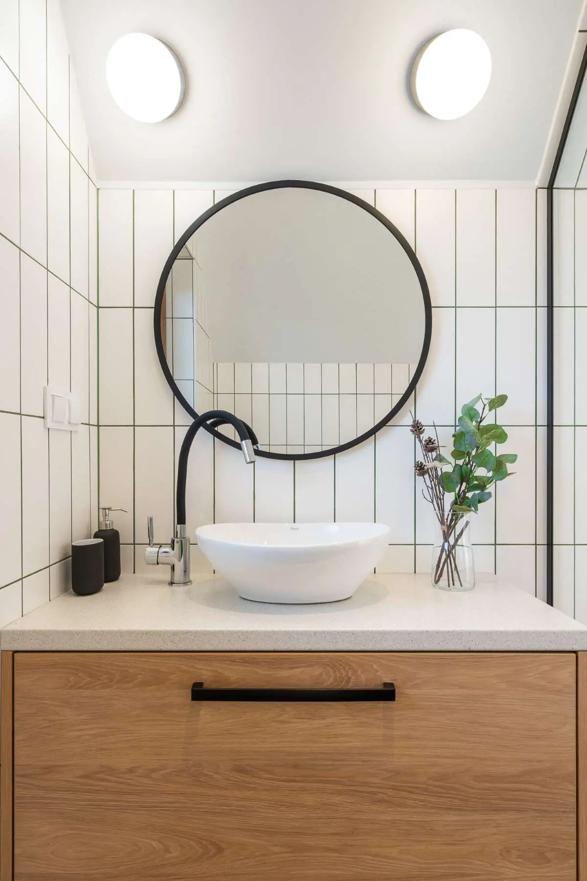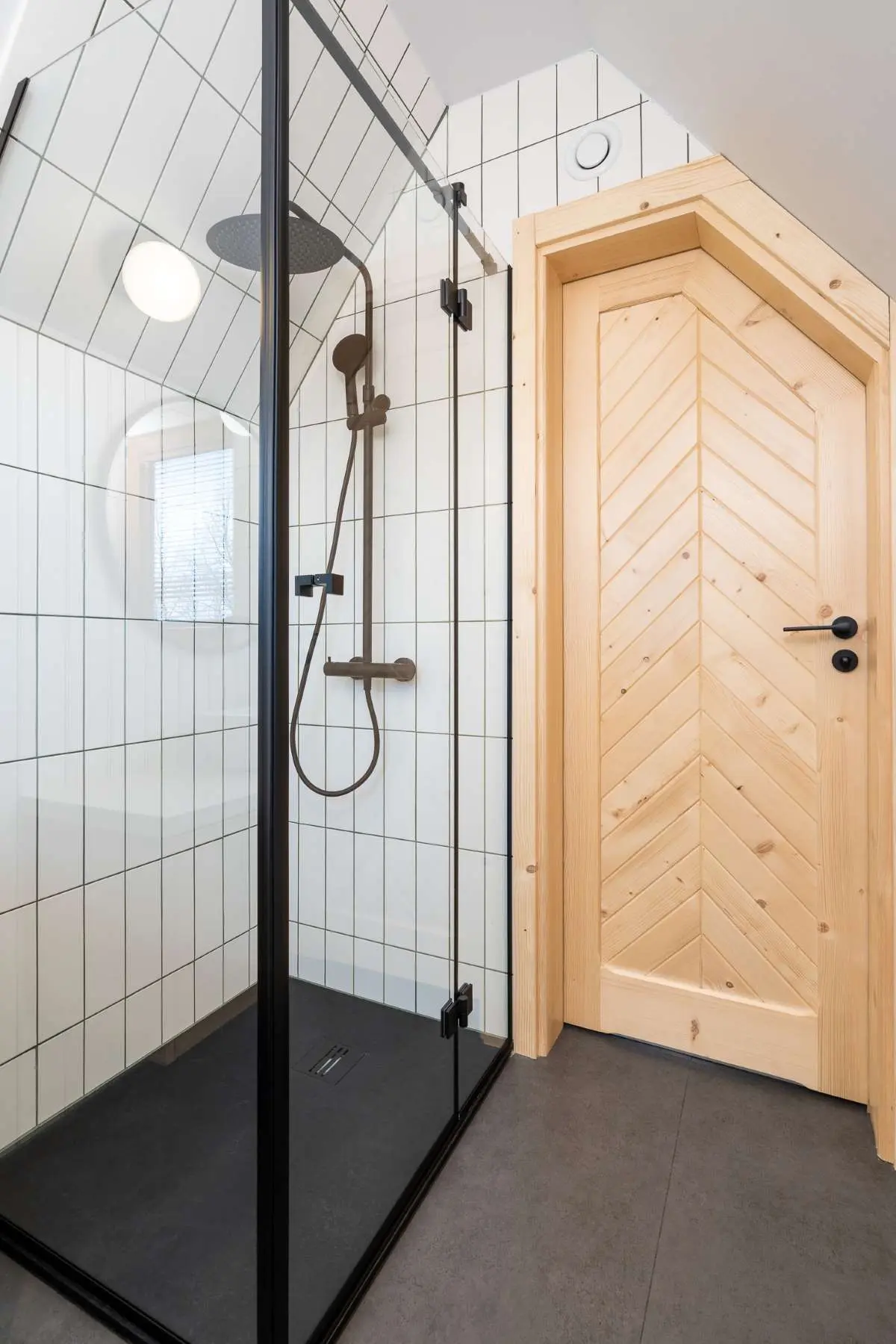Styl łazienki jest spójny z resztą aranżacji. Biały kolor, drewniane akcenty w postaci szafki oraz piękne ręcznie robione drzwi ze wzorem jodełki, nawiązują do stylu zakopiańskiego. Wyzwaniem również był sam prysznic. Skosy nad nim nie pozwalały na zastosowanie typowych rozwiązań, stąd szyba i cała konstrukcja również zostały wykonane na specjalne zamówienie pod konkretny wymiar. Dopełnieniem całości są nietuzinkowe fugi w zielonym kolorze.