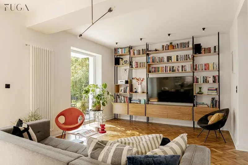 Tym sposobem zachowano przedwojenny klimat domu. W połączeniu z nowoczesnymi rozwiązaniami zaproponowanymi przez architektów, wnętrze jest nie tylko urokliwe, ale też optymalnie funkcjonalne. Przykładem takiego działania są elementy zaprojektowane specjalnie na potrzeby tego wnętrza. Meblem stworzonym według pomysłu architektek jest regał w salonie tworzący ścianę telewizyjną. Jak przyznają projektantki, inspiracją był kultowy mebel marki Vitra. Spersonalizowany projekt meblościanki idealnie wpisuje się w klimat wnętrza.