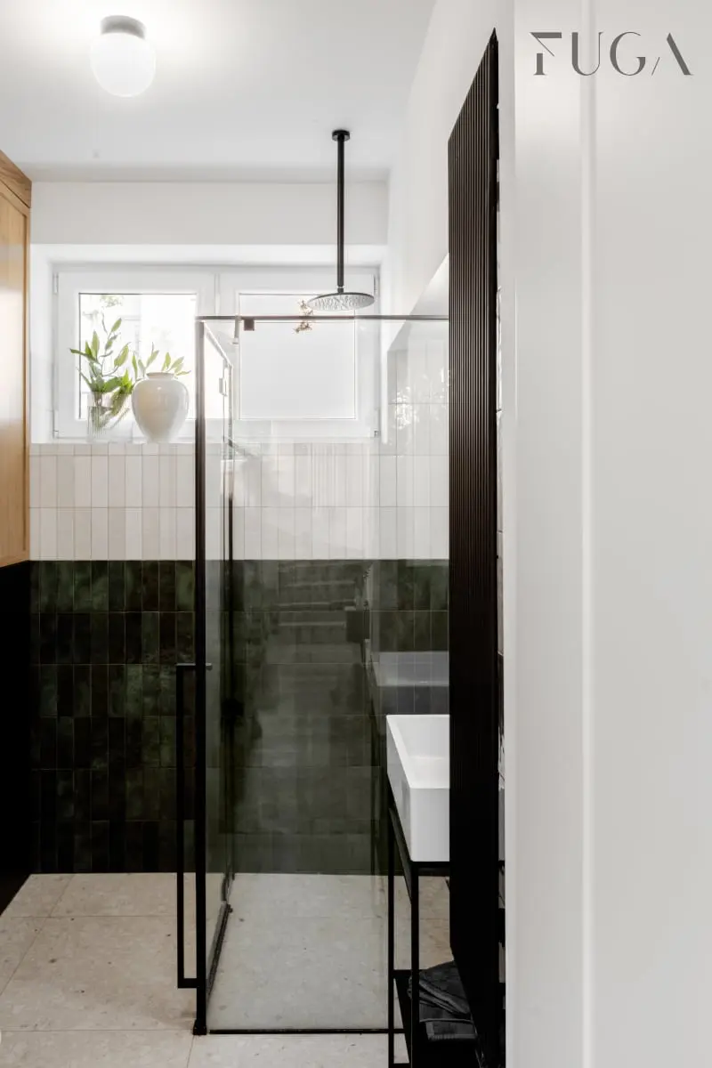 Druga łazienka to zdecydowanie miejsce na szybki prysznic. Ze względu na jej mały metraż, słusznie pojawił się tu odpływ liniowy z minimalistycznym przeszkleniem w czarnej ramie. Na ratunek przyszło też okno będące źródłem naturalnego światła oraz zgrabna kombinacja na ścianach. Do połowy znalazły się tam piękne płytki w kolorze butelkowej zieleni, drugą zajmują białe. Takie zestawienie sprawia, że wnętrze zyskało odpowiednie proporcje a przy tym jest niezwykle stylowe.