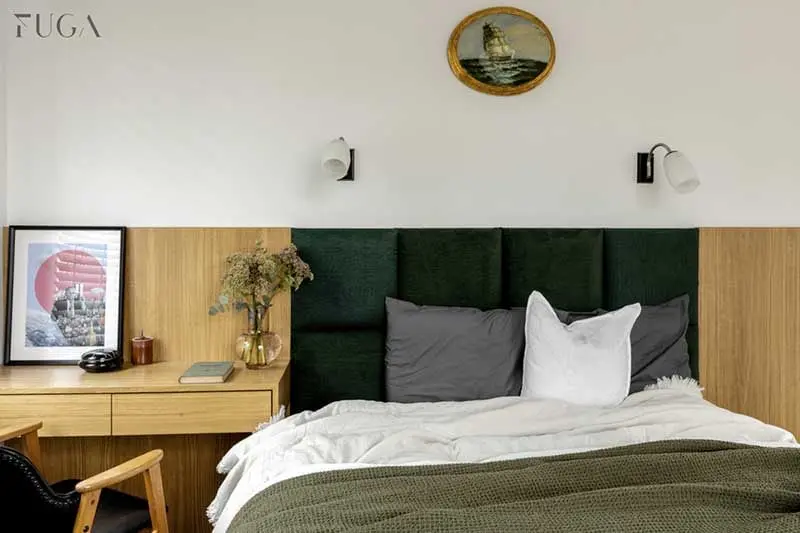 Ciekawym pomysłem architektek jest także łóżko gospodarzy domu ze zintegrowaną toaletką. Przytulności sypialni dodają użyte materiały – dębowy fornir, który jednocześnie chroni ścianę przed zabrudzeniami i welwetowa tkanina w kolorze butelkowej zieleni pełniąca rolę wygodnego zagłówka.